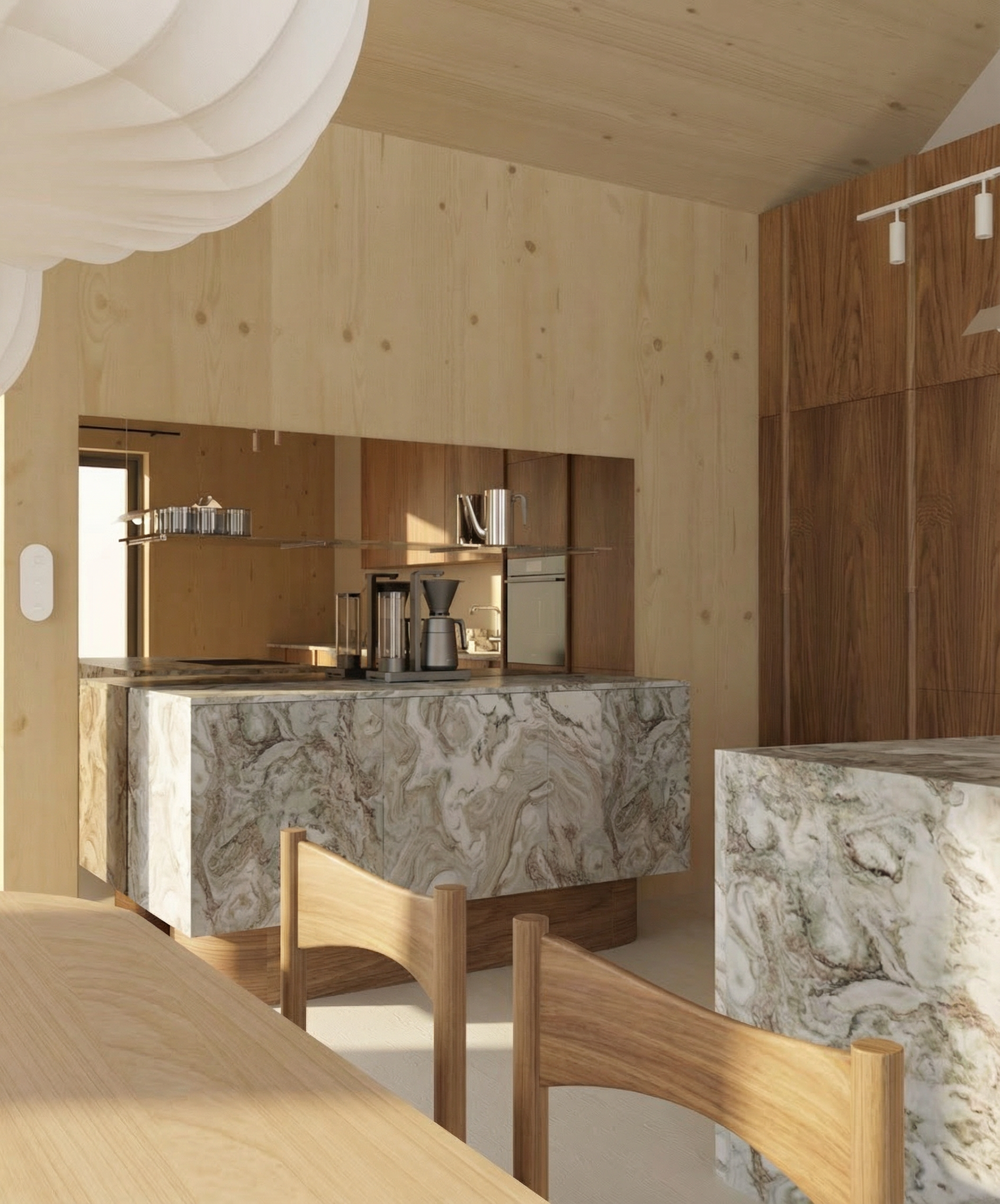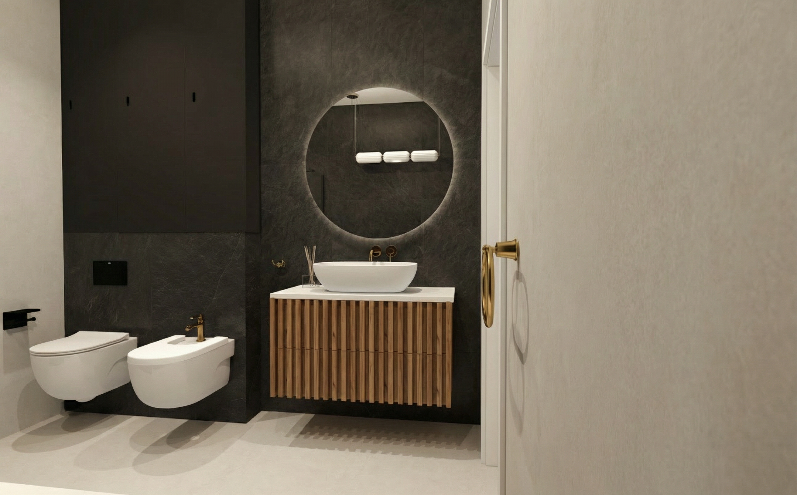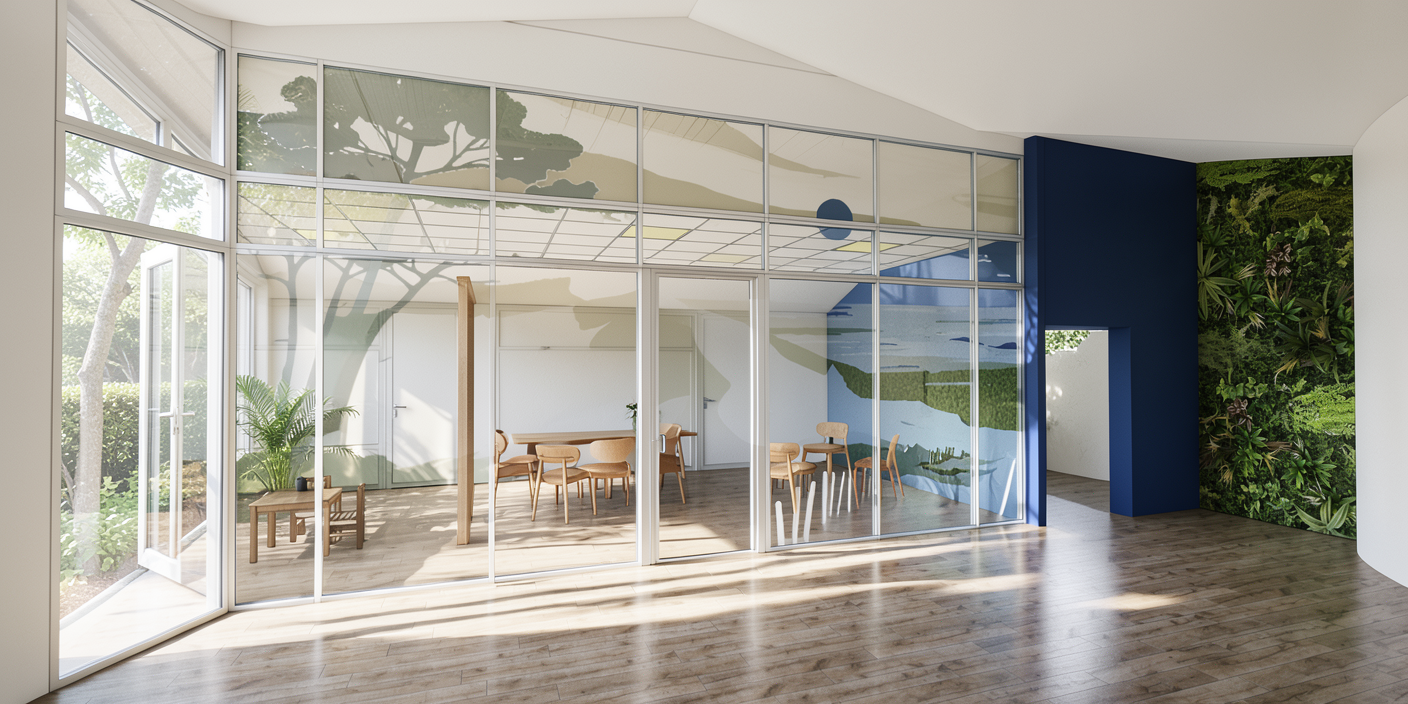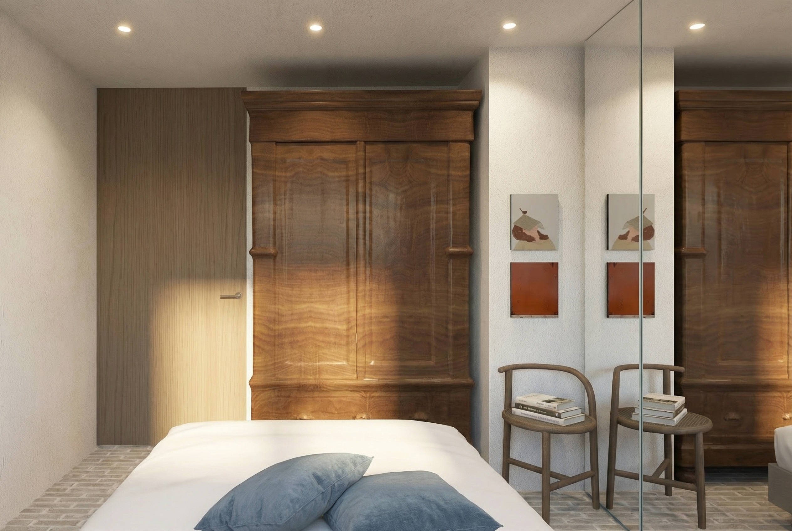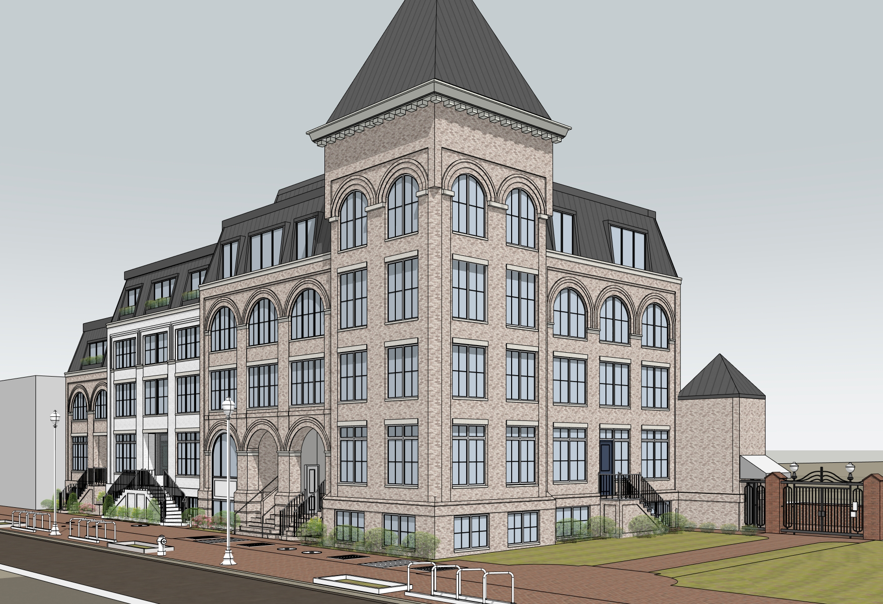 multifamily building in a clear day with blue sky add people and trees on the sidewalk and one car on the street on the left lighter brick colors