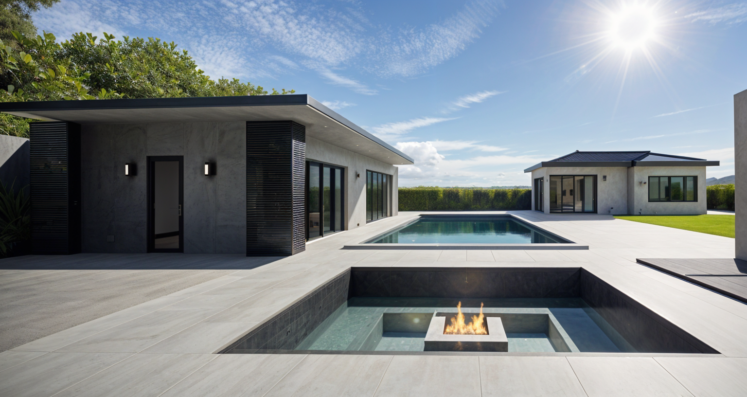 modernist exterior shot black driveway black cladded house black metal shed trees lining fence line grass out the backyard between shed and house architecture