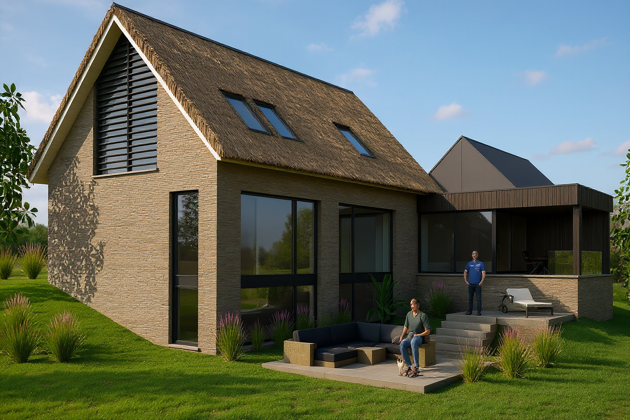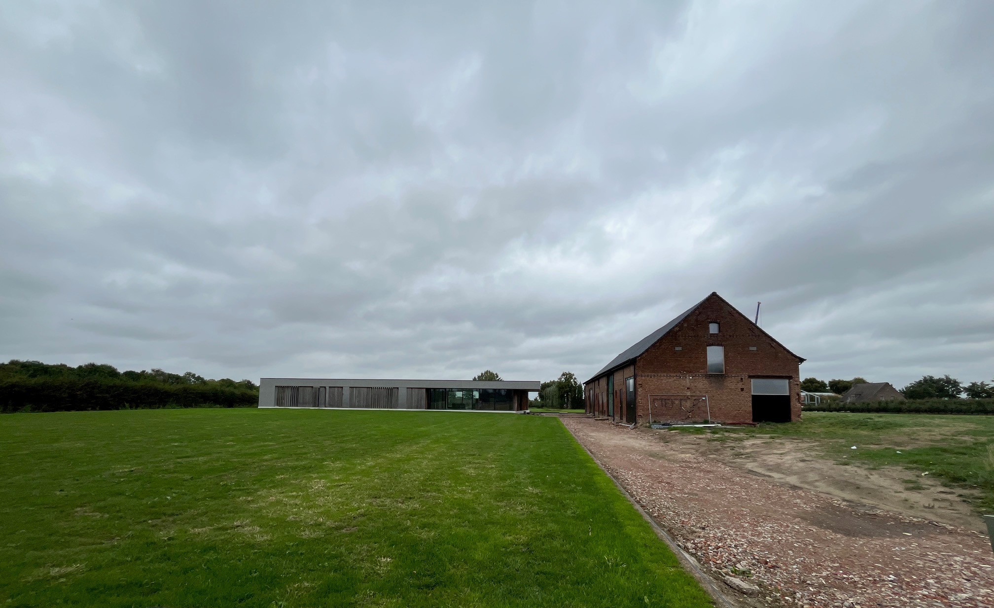 a fresh lawn with some sloping low hills with bushes a few trees scattered here and there among them a big weeping willow the driveway is covered with cobblesones and there s a black tesla parked between the house and the barn on the left side of the driveway there is a row of pollarded willows all the way to the front on the right hand side of the driveway in front of the barn there are bushes of hydrangeas the sky is blue with a few clouds