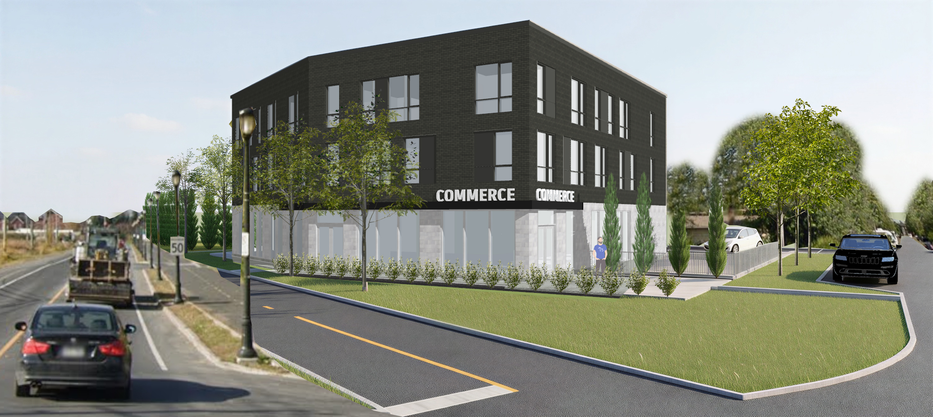 do not modify the windows and grey panels on the building flip 180 degrees the parked automobile on the right as original image on the right keep the image the same but turn the vehicle 180 degrees so that it faces us darker grey flat brick