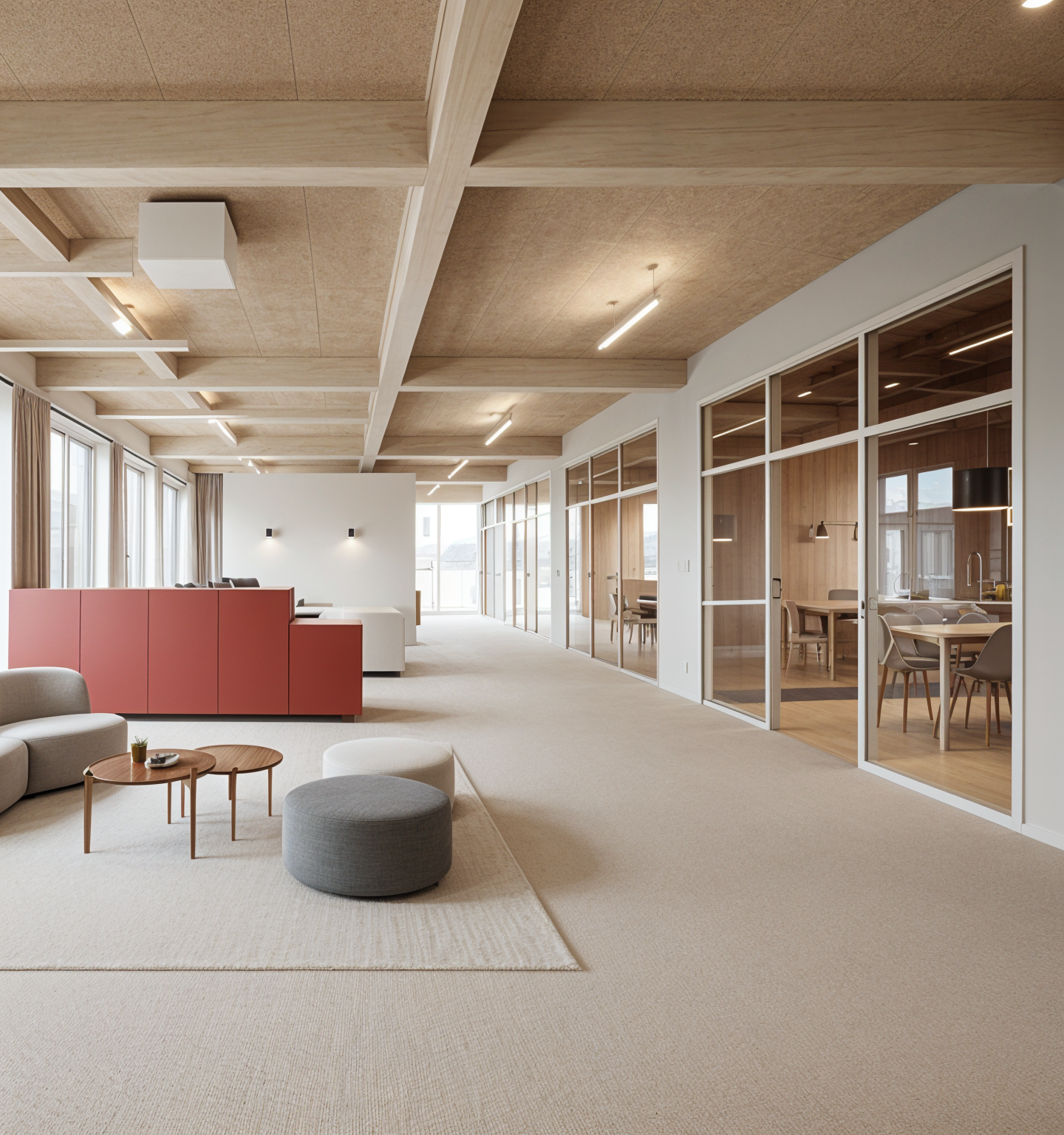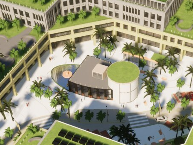 shopping center sand stone shop facade column and window facade palm trees greenery green roof cafes around architecture
