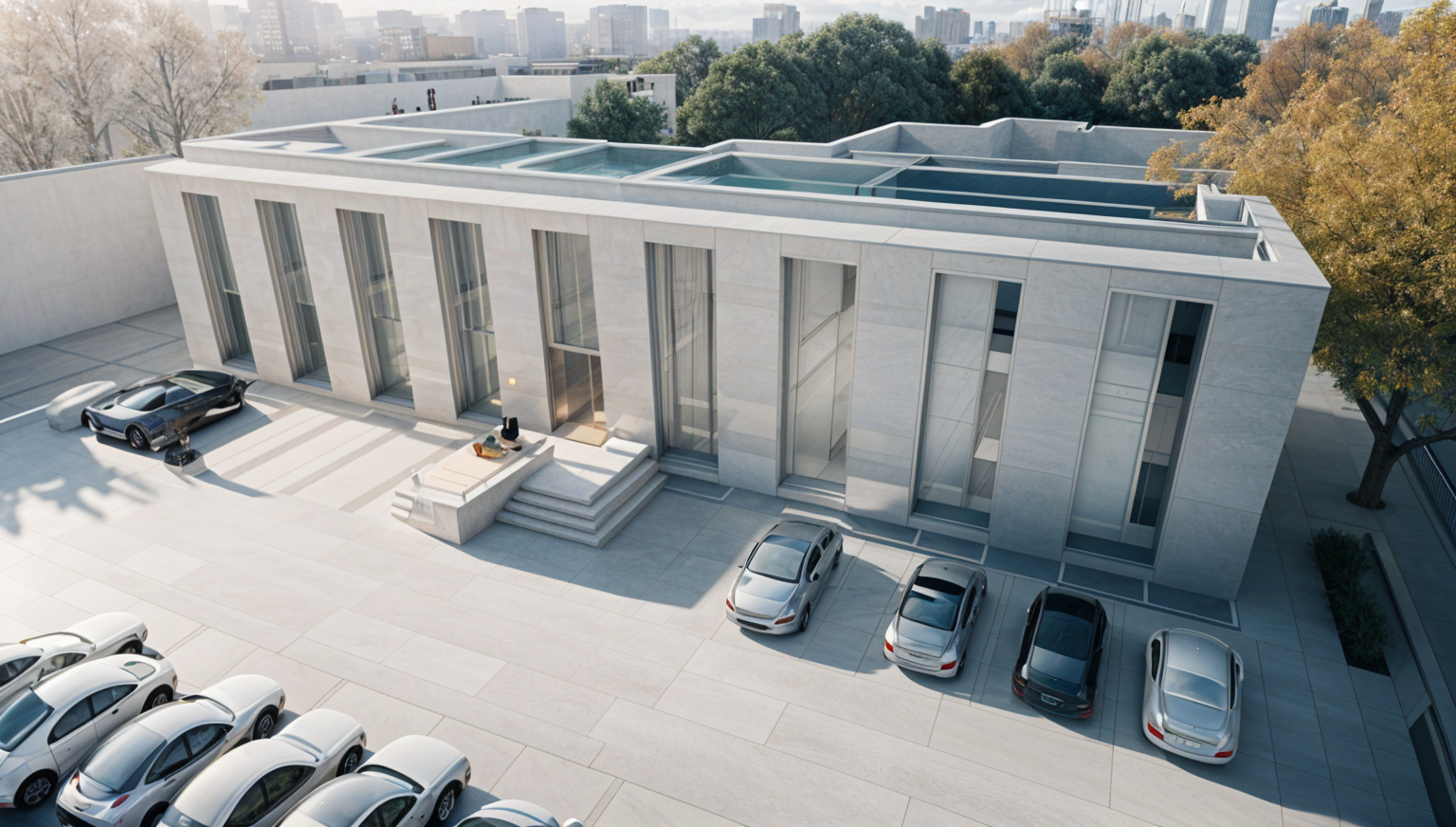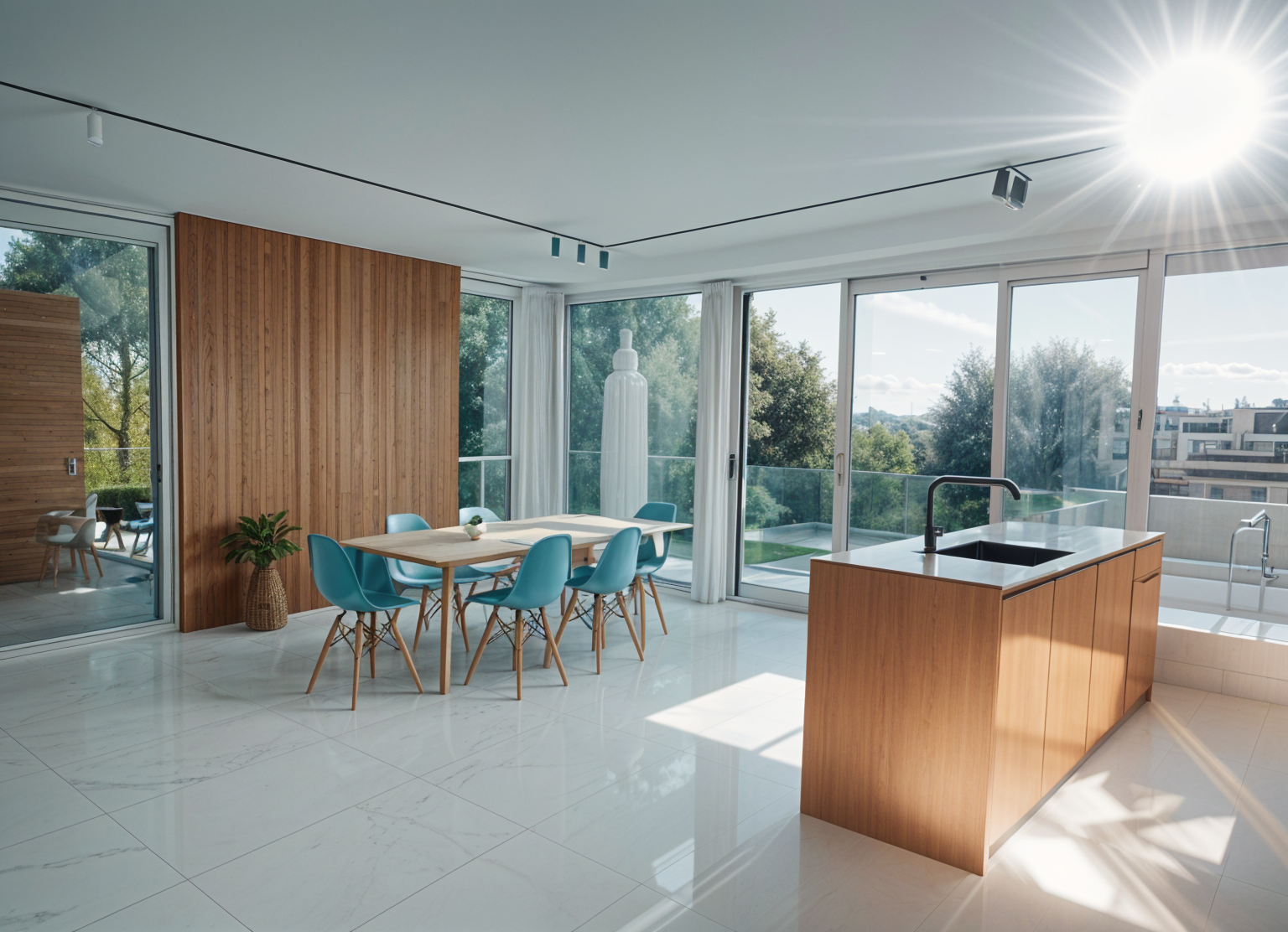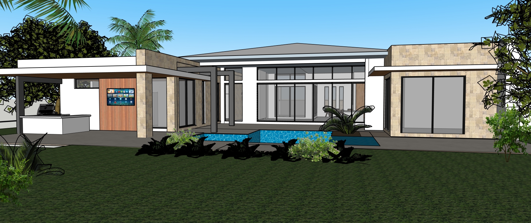 create a hyper realistic exterior photograph of a modern house rear exterior during a vibrant sunny day the house has a sleek tropical modern design with crisp white walls contrasted by some coral stone walls large glass windows reflect the clear blue sky palm trees with their lush green fronds add a tropical touch the house has surrounding green lawn the atmosphere is tranquil and luxurious with sunlight casting gentle shadows evoking a sense of relaxation and opulence