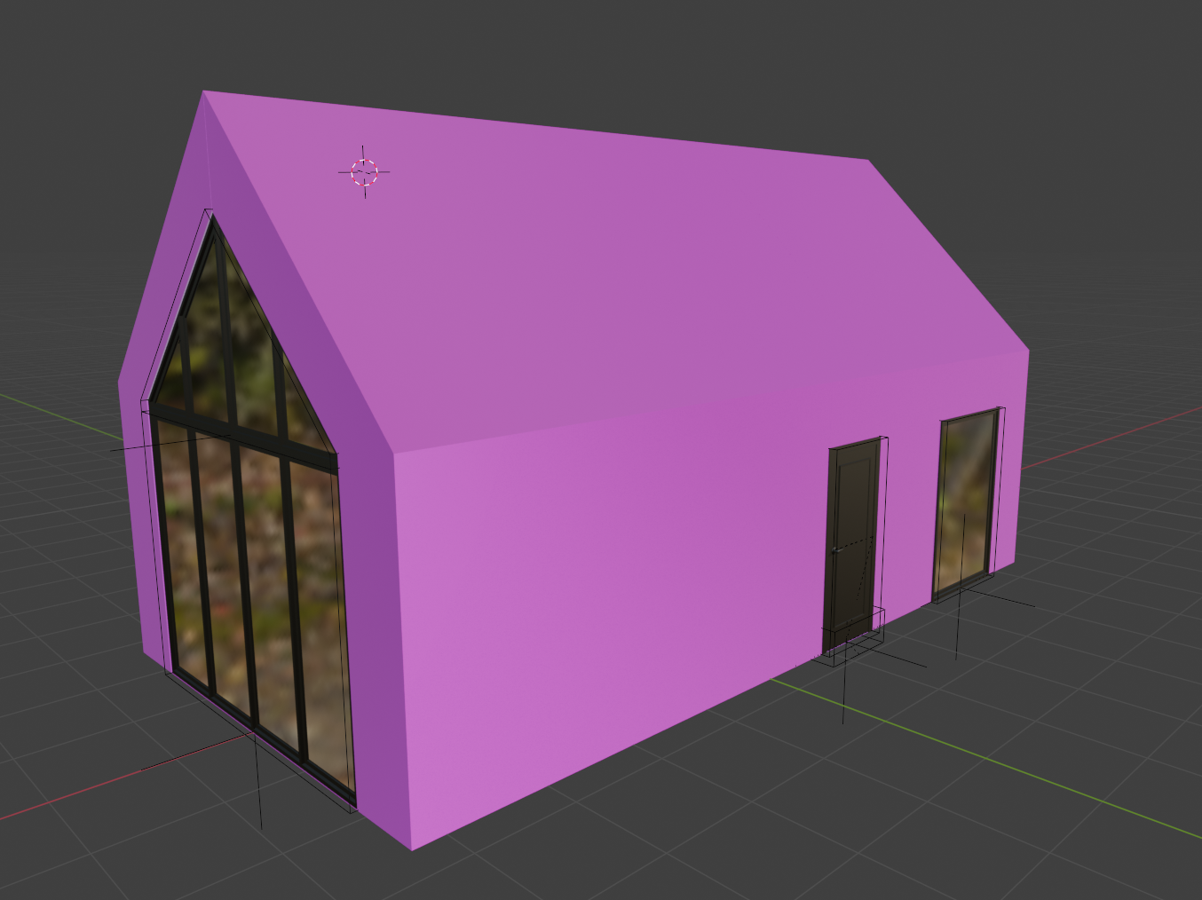 exterior shot modern minimalist house with sharp gabled roof black tile house elevation in gray brick large glass windows with dark frames on the front reflect the lush green forest adding depth and natural beauty elegant black doors add contrast to the facade a large garden with a fruit tree through which the sun shines the background shifts to a soft fuzzy gradient of soft greens and browns suggesting a peaceful forest setting architecture