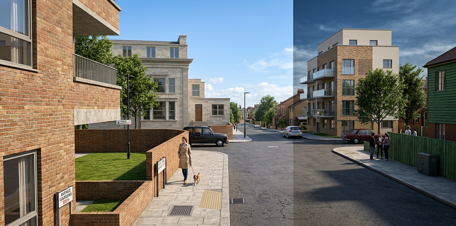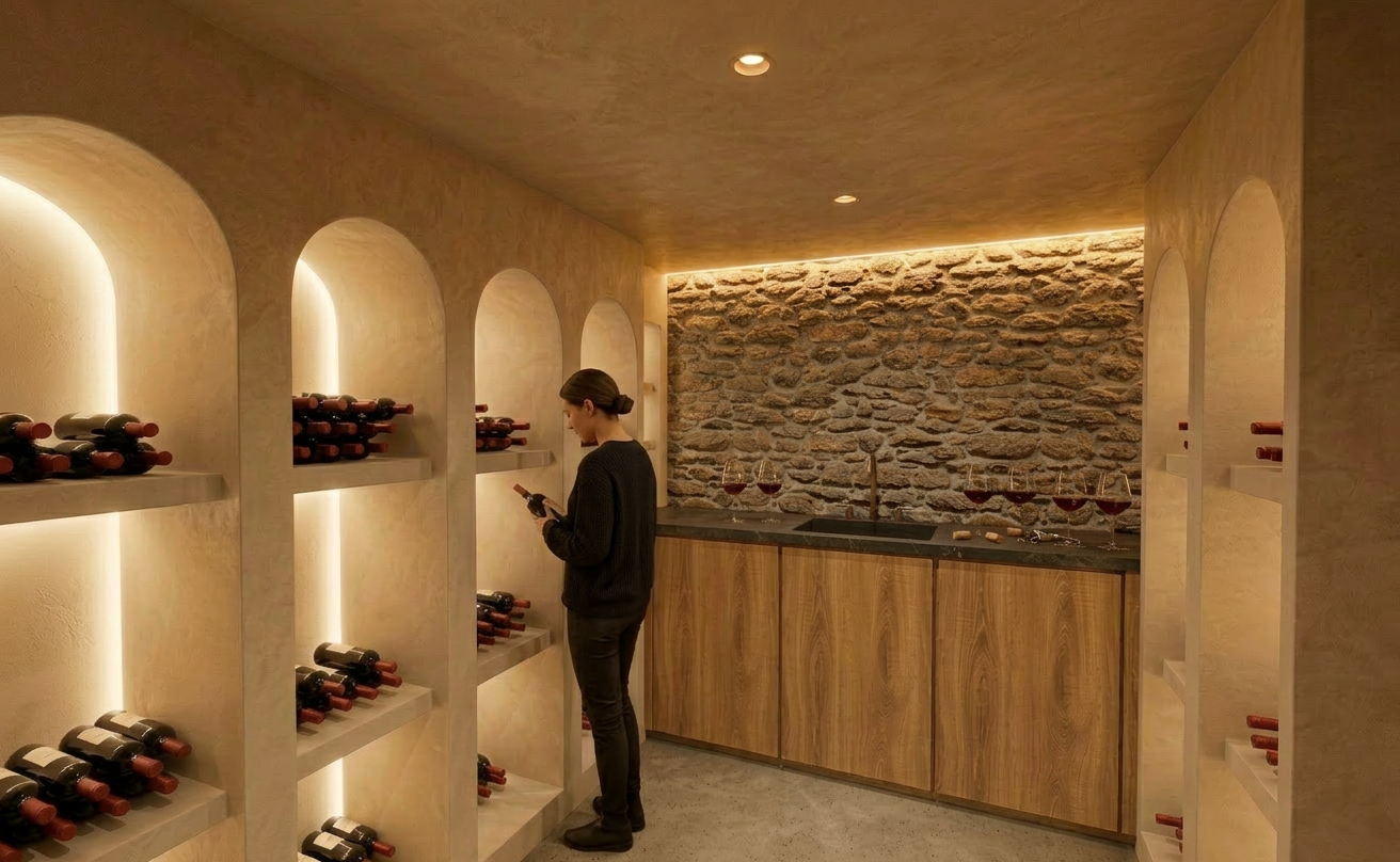 enhance the scene by keeping the same lighting as the other view but make the light warmer with more orange and yellow tones and less white add a led strip along the top of the stone wall place a few wine glasses with wine and a corkscrew naturally on the countertop remove some glasses to reduce clutter integrate the sink seamlessly into the stone countertop make the cabinetry a slightly lighter wood with more attractive grain patterns maintain the minimalist and bright atmosphere of the room