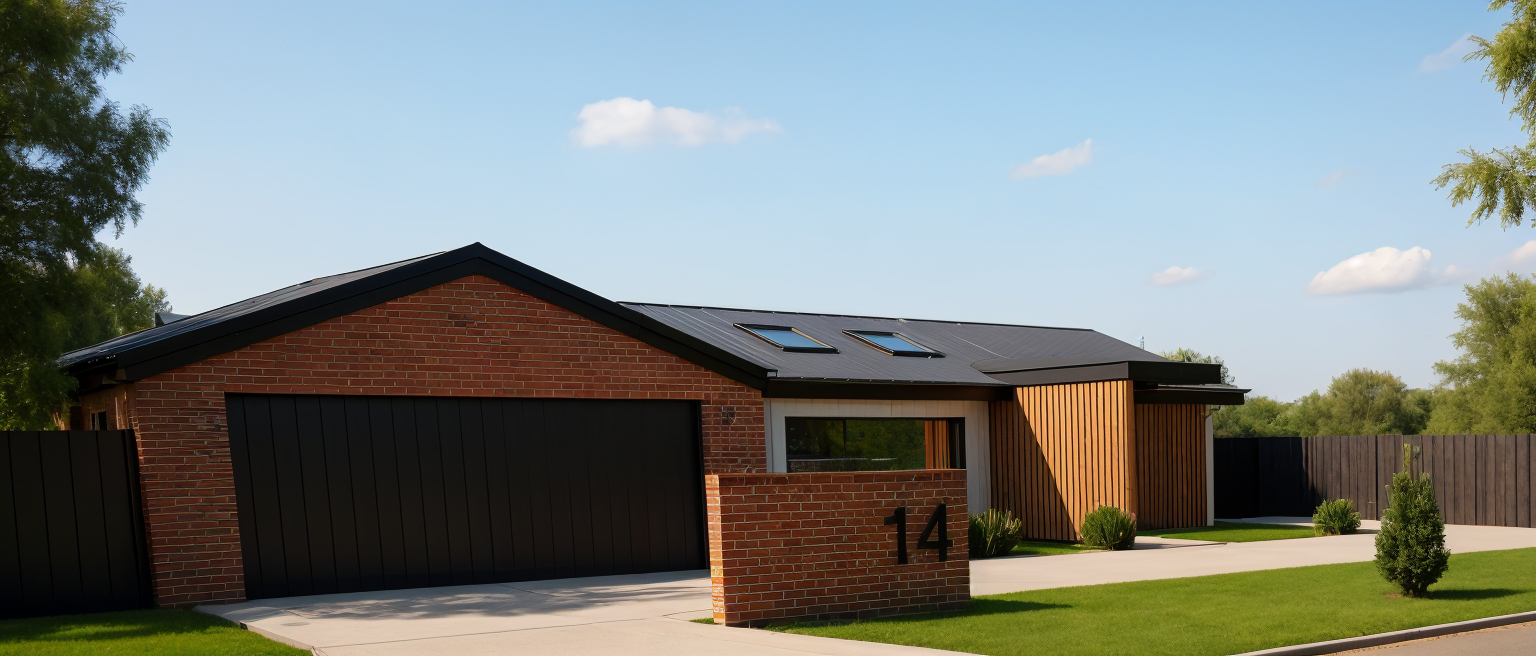 a beautiful modern country house with dark gray shingles light grey horizontal siding with light cream trim and a stained garage door the atmosphere is cozy yet elegant the windows reflect a warm golden glow suggesting a serene late afternoon setting the lush greenery surrounding the house features various shades of vibrant green offering a sense of tranquility delicate white blossoms add a touch of delicate beauty while the stone path and steps enhance the natural rustic charm architecture