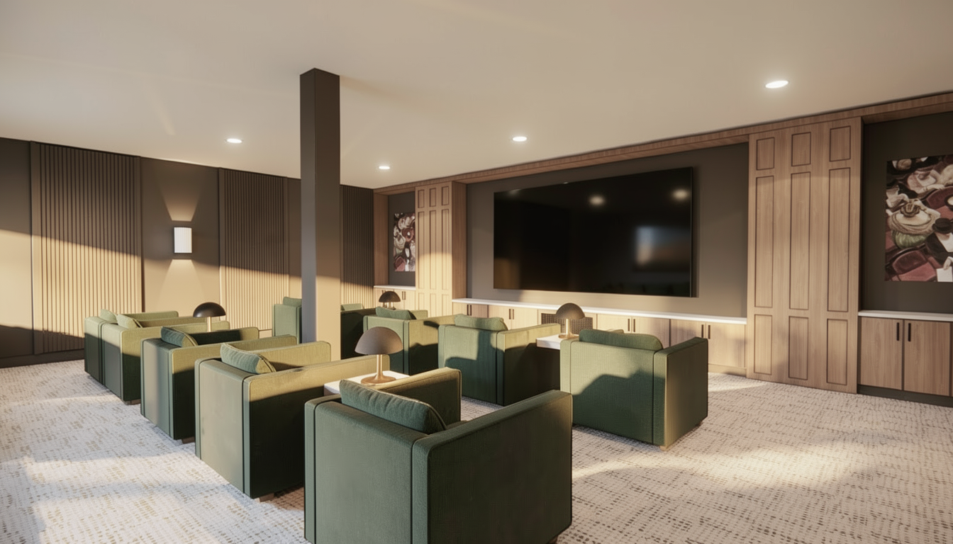 render a picturesque scene of a modern suburban house with a beautifully textured white exterior and dark shutters the roof is a deep charcoal gray perfectly contrasting against the light facade the driveway is a smooth light tan color leading up to the house a lush vivid green lawn surrounds the property creating a natural inviting atmosphere capture the setting in a warm golden hour light casting soft long shadows and a serene sky with hints of blue and light fluffy clouds include a vast gentle landscape in the background to enhance the peaceful ambiance