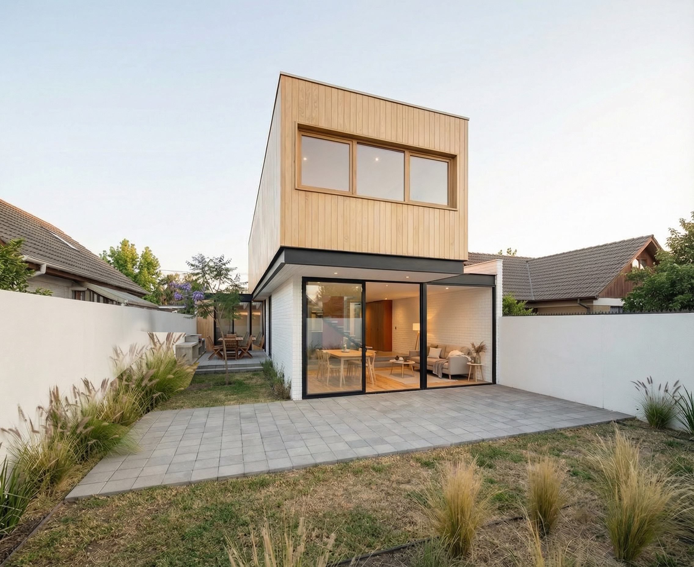 exterior image render instructions it is very important that the base geometry is not modified under any circumstances i made several corrections using pencil marks and cut and paste adjustments on the reference image these corrections must be accurately interpreted and merged into a single cohesive design resulting in one unified and realistic 3d model please review the floor plans as some areas are incorrectly drawn correct them without altering the intended design and maintain the existing wood color the final image must be a highly realistic render with a scandinavian architectural style clean lines simple volumes natural materials and a warm calm atmosphere interior visible through the windows invert the positions of the dining area and the living area compared to the current layout ensure the interior reads clearly and naturally through the windows without changing the exterior geometry