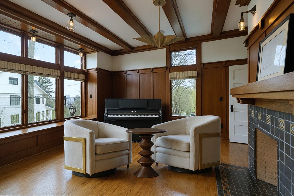interior watercolor rendering of contemporary dayroom with very high double high ceilings outside of windows is view of misty forest clouds over a cliff with cozy funiture and futuristic glass and stone stairs with ada compliable handrails