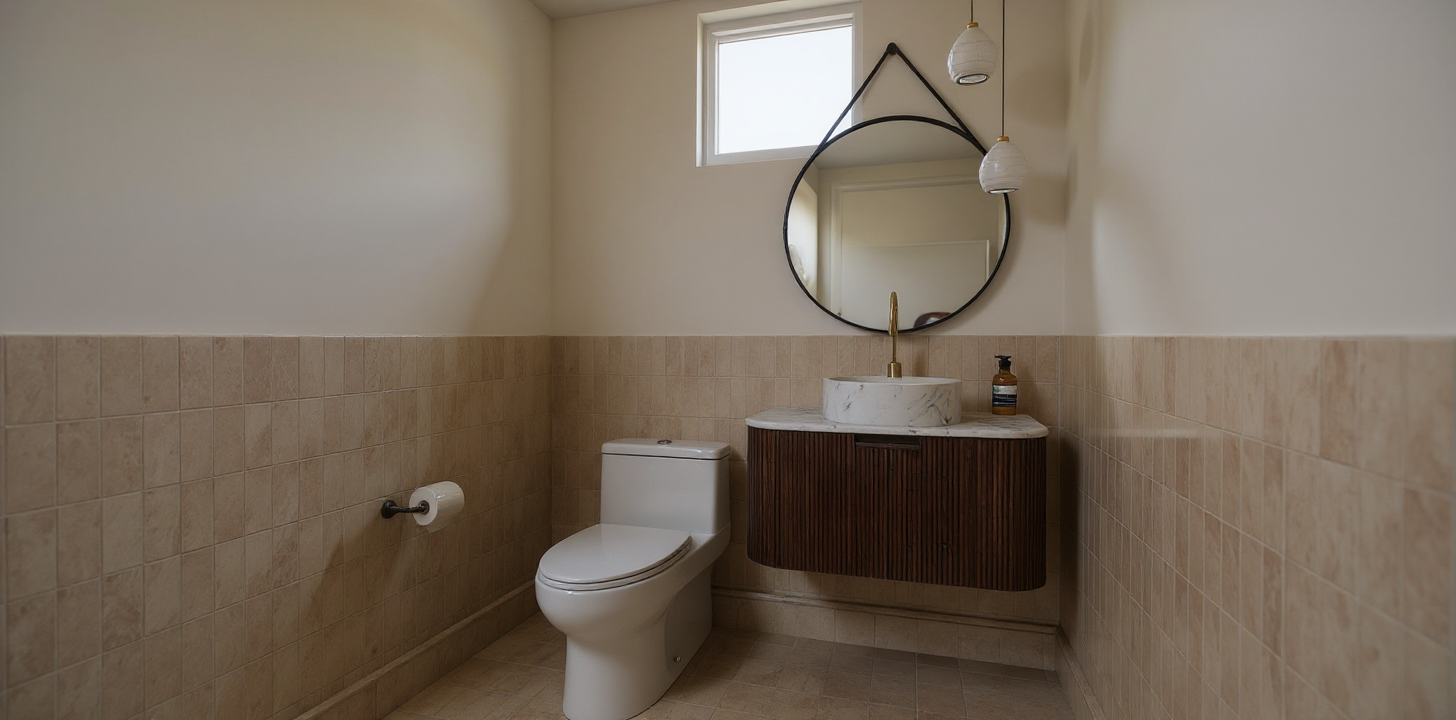 interior shot make it 3 drawers and painted white with a marble top not oak also remove the sconce and center the sink