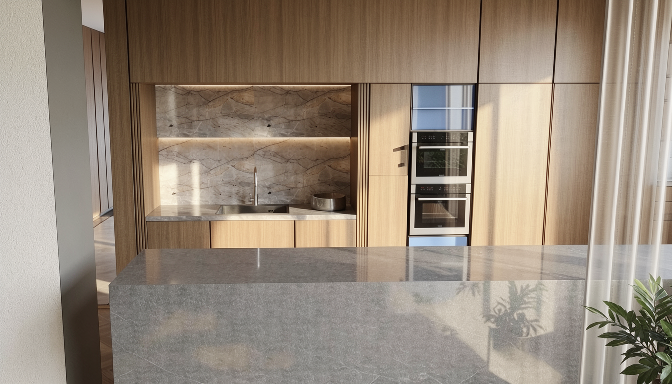 prompt dla archsynth maintain colors precision hyperrealistic interior kitchen render convert the attached kitchen design screenshot into a photorealistic architectural visualization maintain exact layout proportions and placement of every element from the input image strict layout rules do not add remove or reposition any element every cabinet appliance vent grille outlet and shelf must stay exactly where it is in the input preserve electrolux built in oven left tall cabinet induction hob countertop left side dark tall faucet with sink right side of countertop two wall outlets above countertop narrow open shelves between upper cabinets hood extractor above open shelves vent grilles bottom and top of right tall cabinet top of left tall cabinet no decorations plants dishes food or accessories the kitchen must be empty exactly as in the design critical two different cabinet colors this is the most important aspect this kitchen uses two distinct cabinet colors they are not the same you must render them as clearly different from each other color 1 lower cabinets tall columns left and right kronospan 5981 cashemere warm cashmere beige a noticeable creamy warm beige tone matte smooth finish no wood grain this color is visibly darker and warmer than the upper cabinets applies to all base lower cabinets drawer fronts the full height tall cabinet on the left around the oven and the full height tall cabinet on the right color 2 upper wall cabinets hanging cabinets above the countertop kronospan k680 stone beige very light beige almost white significantly lighter than the lower cabinets cool toned pale with a subtle stone like texture matte finish this color is visibly lighter and cooler close to off white applies to all wall mounted upper cabinets only the contrast between these two colors must be clearly visible in the render the upper cabinets should appear almost white while the lower cabinets and tall columns should appear distinctly warmer and darker in a cashmere beige tone if both cabinet zones look the same color the render is wrong other materials countertop and wall backsplash panel grey marble with warm beige brown veining slight sheen egger f095 st87 siena grey marble walls pure white matte floor light grey concrete look tiles matte large format render settings camera angle identical to input corner view slightly from the left lighting soft natural daylight from the left above gentle shadows for depth no harsh contrasts lighting must be even enough to clearly show the color difference between upper and lower cabinets quality photorealistic architectural interior render 4k resolution style clean minimalist modern scandinavian surface realism subtle reflections on marble countertop slight sheen matte cabinet fronts with soft light falloff realistic concrete tile texture on floor no vignette no dramatic color grading neutral true to life color rendition