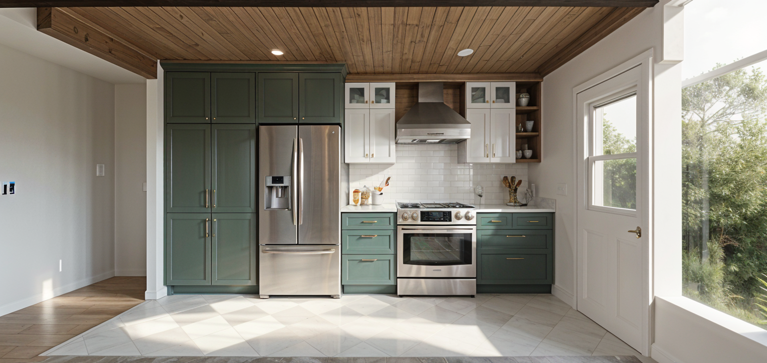 preserve all materials colors and finishes exactly no reinterpretation no enhancement no design changes lighting and shadows only neutral daylight if a choice must be made do not change the original material the kitchen hood is a fixed design element the shelfs are fixed design element th floor tile is a fixed design element