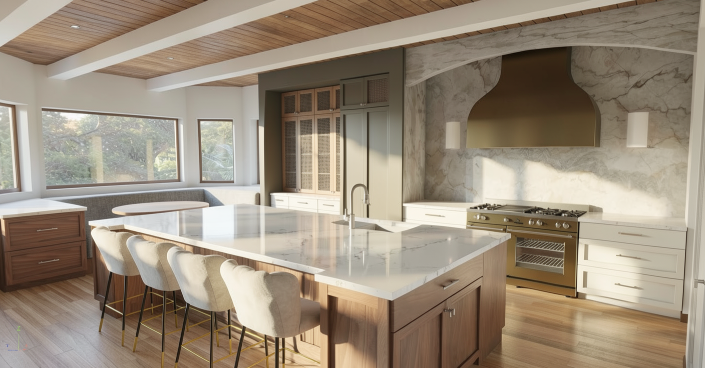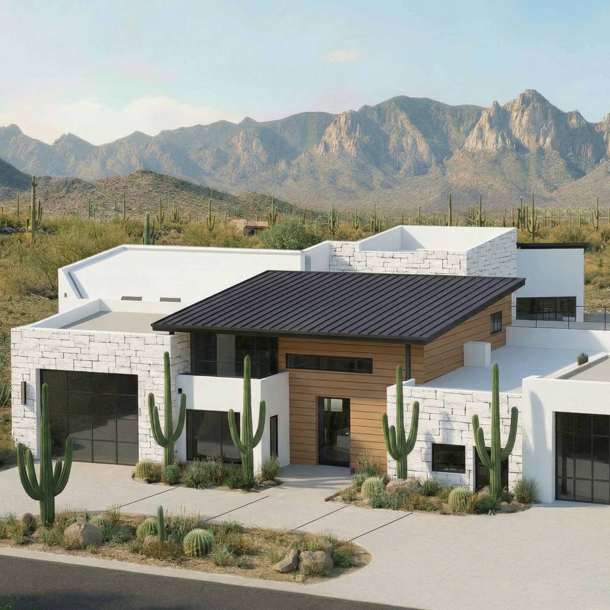 without changing the structure of the building only replace the exterior stone cladding on the mass behind the wood cladded mass change the stone cladding to the white stucco referenced in the attached image do not change any of the stone cladding to any of the front masses keep them cladded with stone do not change the landscape or background