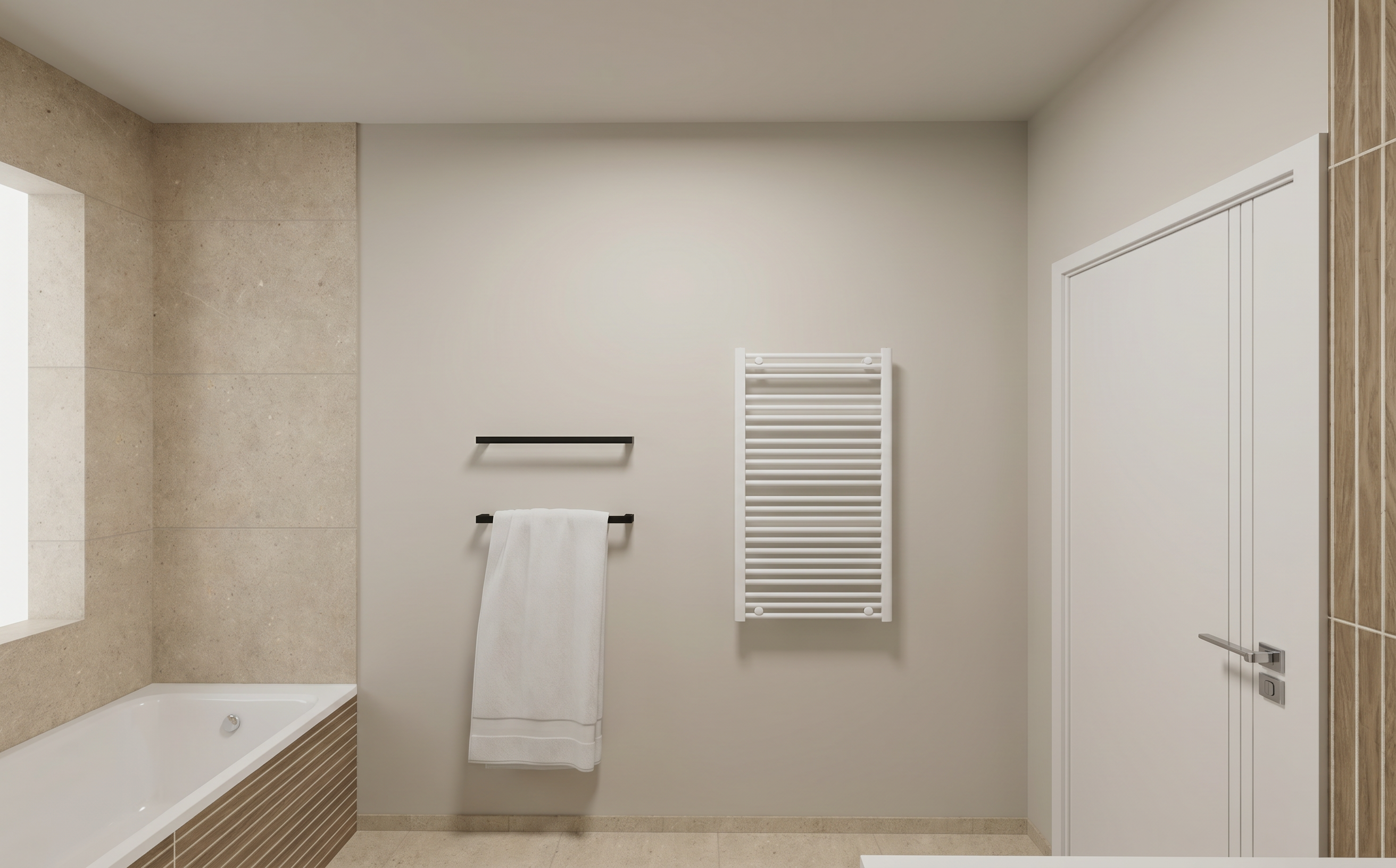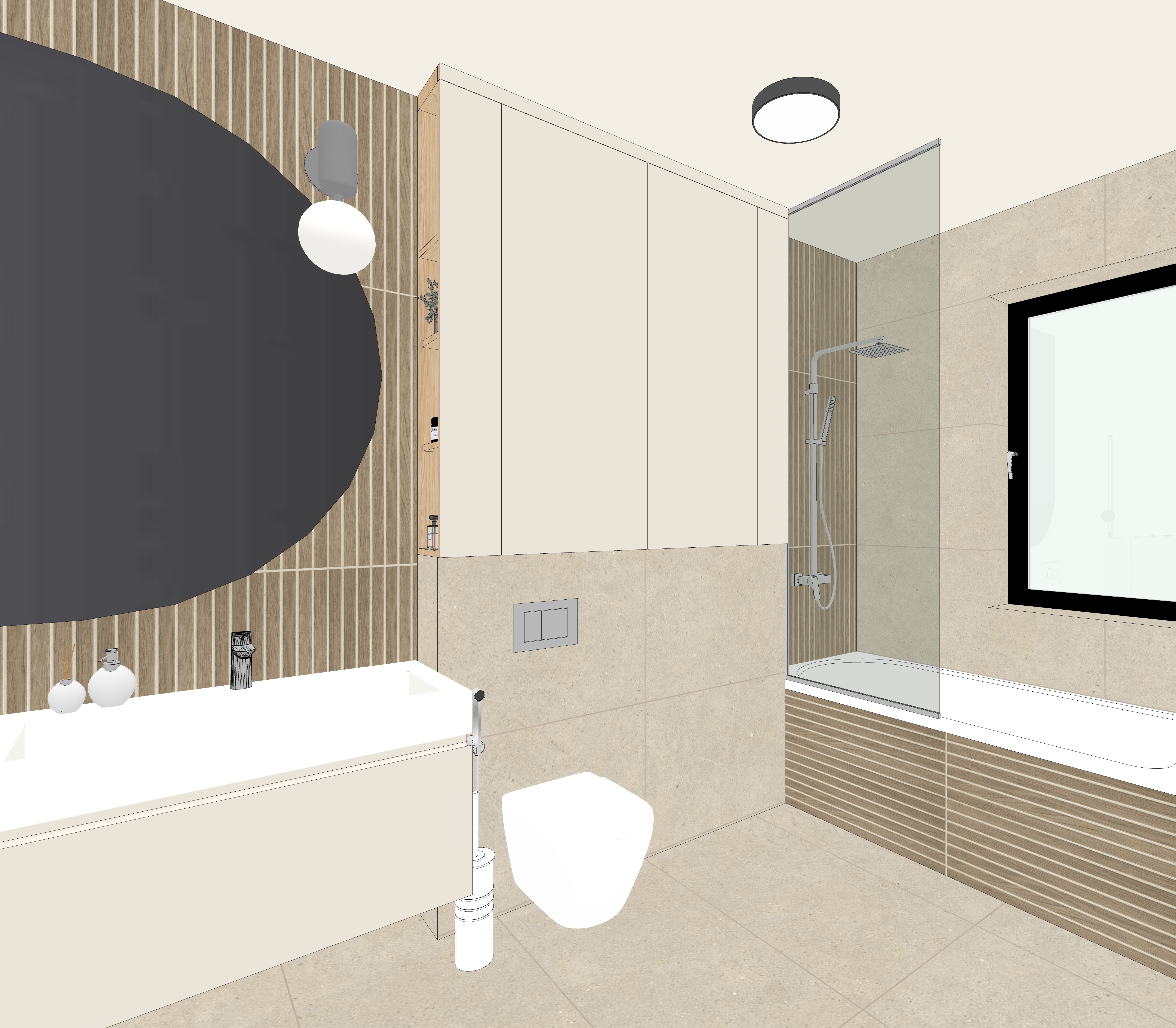 act as a world class architectural visualizer and 3ds max corona renderer master i am providing an image of a 3d bathroom scene taken from a frontal perspective i need you to generate an ultra photorealistic architectural render based exactly on this geometry and layout do not change anything in the scene preserve exact layout proportions camera angle materials object placement and composition materials strict preservation ceramic tiles cream on walls and floor natural beige stone look subtle texture variation exactly as in 3d the second darker ceramic on wall the one more must have slightly wood graines keep all grout lines visible correct spacing and exact colour as in image of reference on the darker ceramics must be white and the grout from cream ceramic must be slightly darker than ceramic cream vanity and cabinet soft matte finish realistic imperfections entrance door in white matte paint flat finish no gloss preserving exact vertical line detailing panel pattern as in the original 3d model the left wall must be preserved exactly as in the original image light greige color warm beige grey matte paint finish no texture change no added elements ceiling must be light greige same tone family as right wall smooth matte finish uniform color sink faucet element must be chrome shower system must be chrome toilet flush plate must be chrome accessories physically accurate reflections slightly imperfect the wall lamp above sink must have chrome accesories toilet brush accesories must be white exactly as in 3d shower screen must be clear transparent glass not frosted with realistic reflections refraction and subtle edge highlights the grey element arc above the sink is a mirror not a solid panel reflective surface slightly imperfect with subtle distortion and realistic reflections of the space the radiator must be white matt entrance door in white matte paint flat finish no gloss preserving exact vertical line detailing panel pattern as in the original 3d model lighting very important warm led backlight behind the mirror 2700k 3000k soft halo glow on wall neutral ceiling light 4000k diffused and even mirror light fixture emitting warm light slightly stronger contrast vs ceiling light physically accurate global illumination corona style realistic light bounce soft contact shadows natural falloff realism details subtle roughness variation on ceramics micro imperfections on wood ceramic grain slight unevenness chrome with realistic reflections not perfect mirror slightly used look mirror reflections must be physically correct include environment reflection no flat shading transparent glass must show realistic thickness reflections and refractions soft ambient occlusion in corners under vanity and near floor accurate contact shadows and edge definition camera render settings eye level perspective same framing as reference realistic exposure balanced whites no overexposed highlights cinematic dynamic range sharp but natural no over sharpening style ultra photorealistic high end architectural visualization corona renderer look clean minimal natural tones no added objects no styling changes no redesign