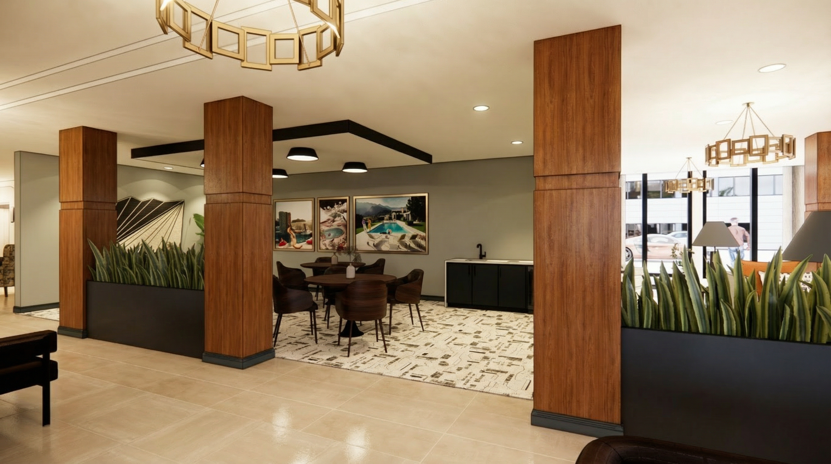 add a patio and a small quebec town terrace behind the patio door some decorations on the empty shelves near the sofa two cushions on the sofa and rays of sunlight coming in
