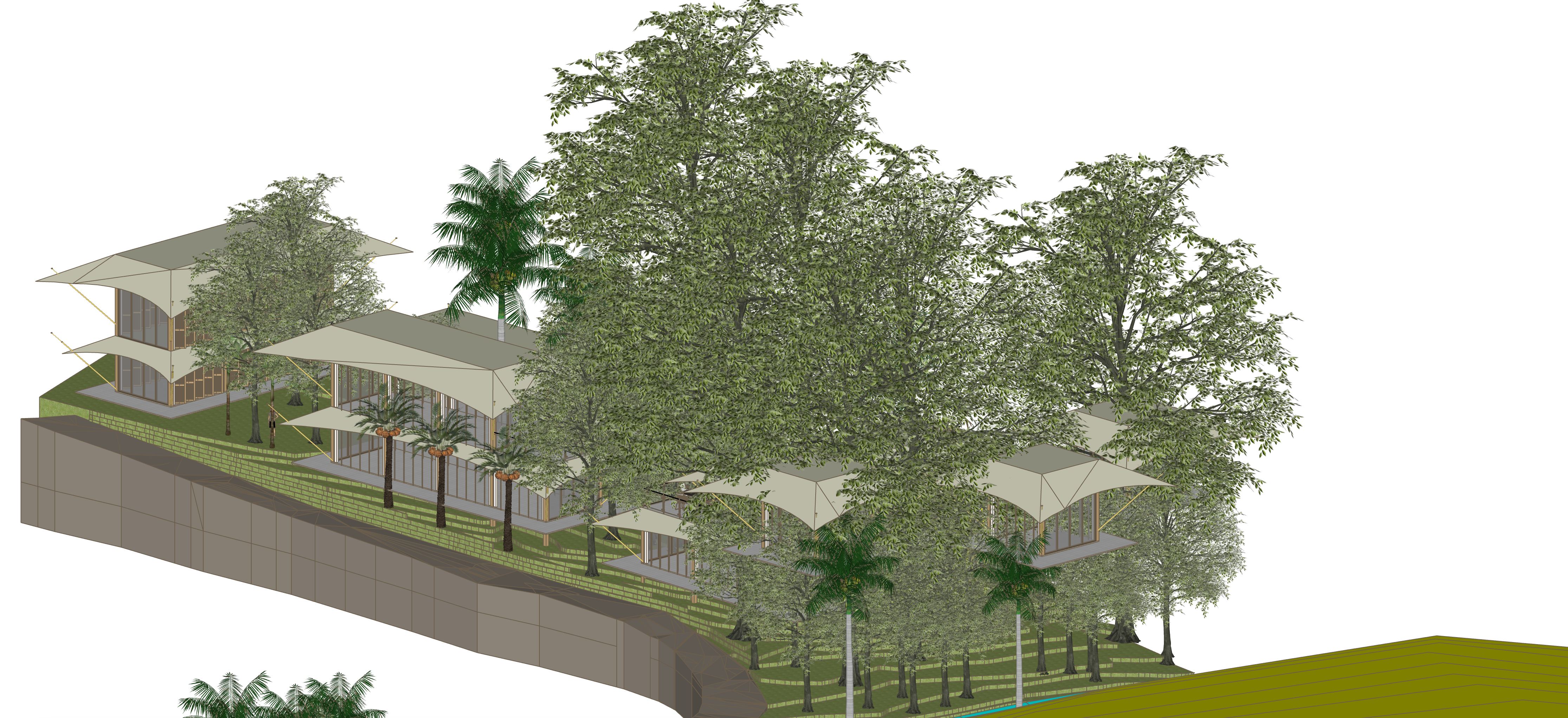 archsynth render from a low top down drone angle focused tightly on the tent roof surfaces maintain the exact 3d building arrangement and camera constraints show detailed texture of the light brown tent roofs merging harmoniously with surrounding dense forest vegetation the narrow road briefly appears at the front edge of the shot with the river visible deeper down the slope preserve realistic daylight canopy shadows and natural roof highlights
