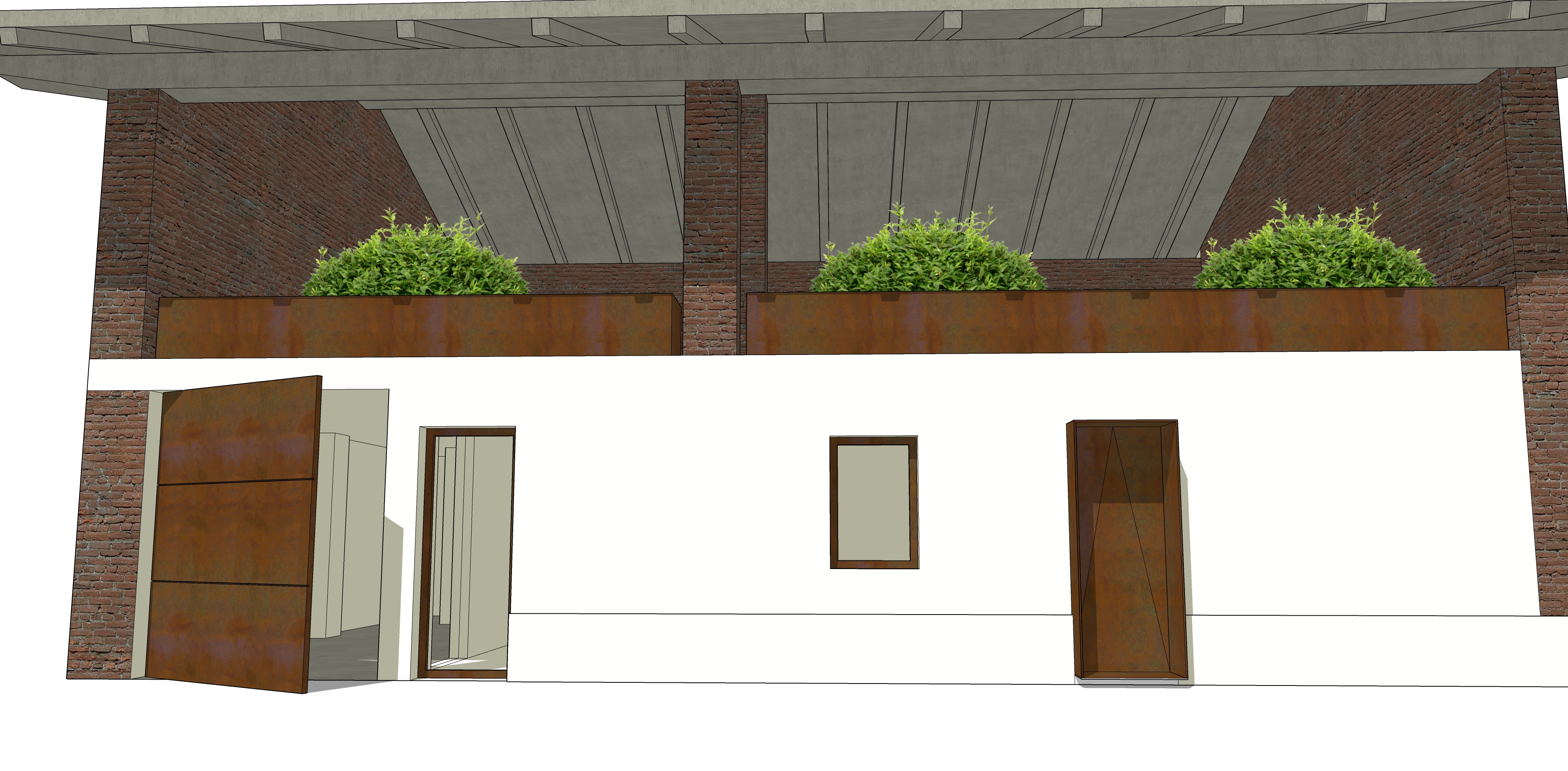 mantieni i materiali della vista in particolare l acciaio corten delle fioriere e inserisci verde nelle fioriere includilo in contesto di campagna pianeggiante con piante l intonaco bianco e la struttura del tetto in cls pavimento in terra misto erba