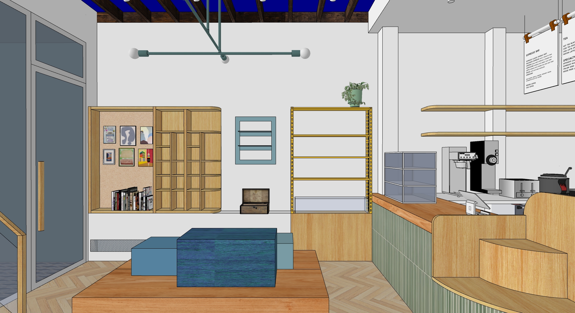this is a coffee shop show soft natural light do not render any windows in this image do not add any lighting other than the lights shown in the view do not change the structure of the original image do not change any colors or finishes do not add any finishes or objects or elements light is coming from the left side do not add any integral lighting do not add any objects on shelves