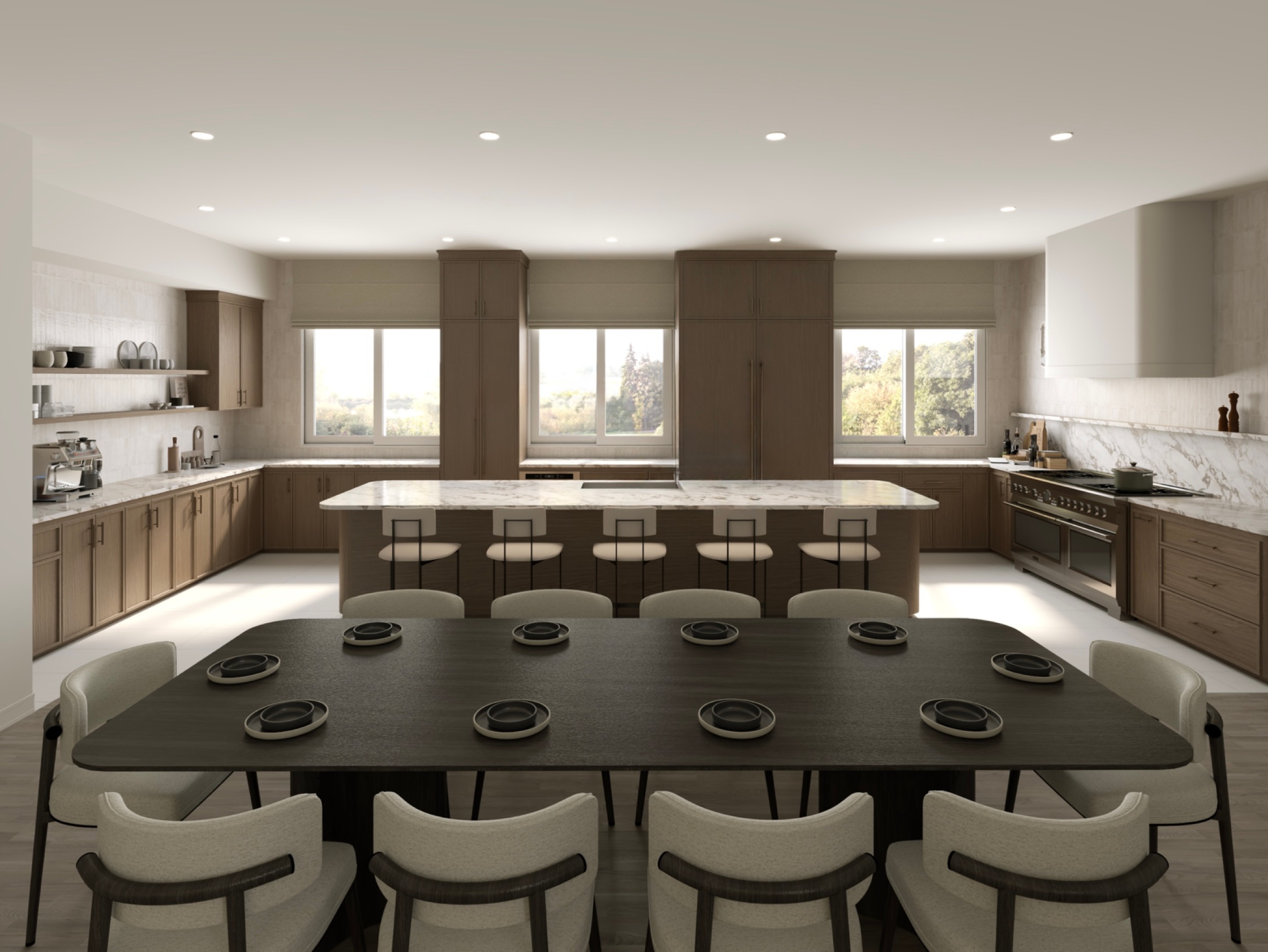 add upper wall cabinets to the right side of kitchen and replace dining tablle with round glass table and chairs