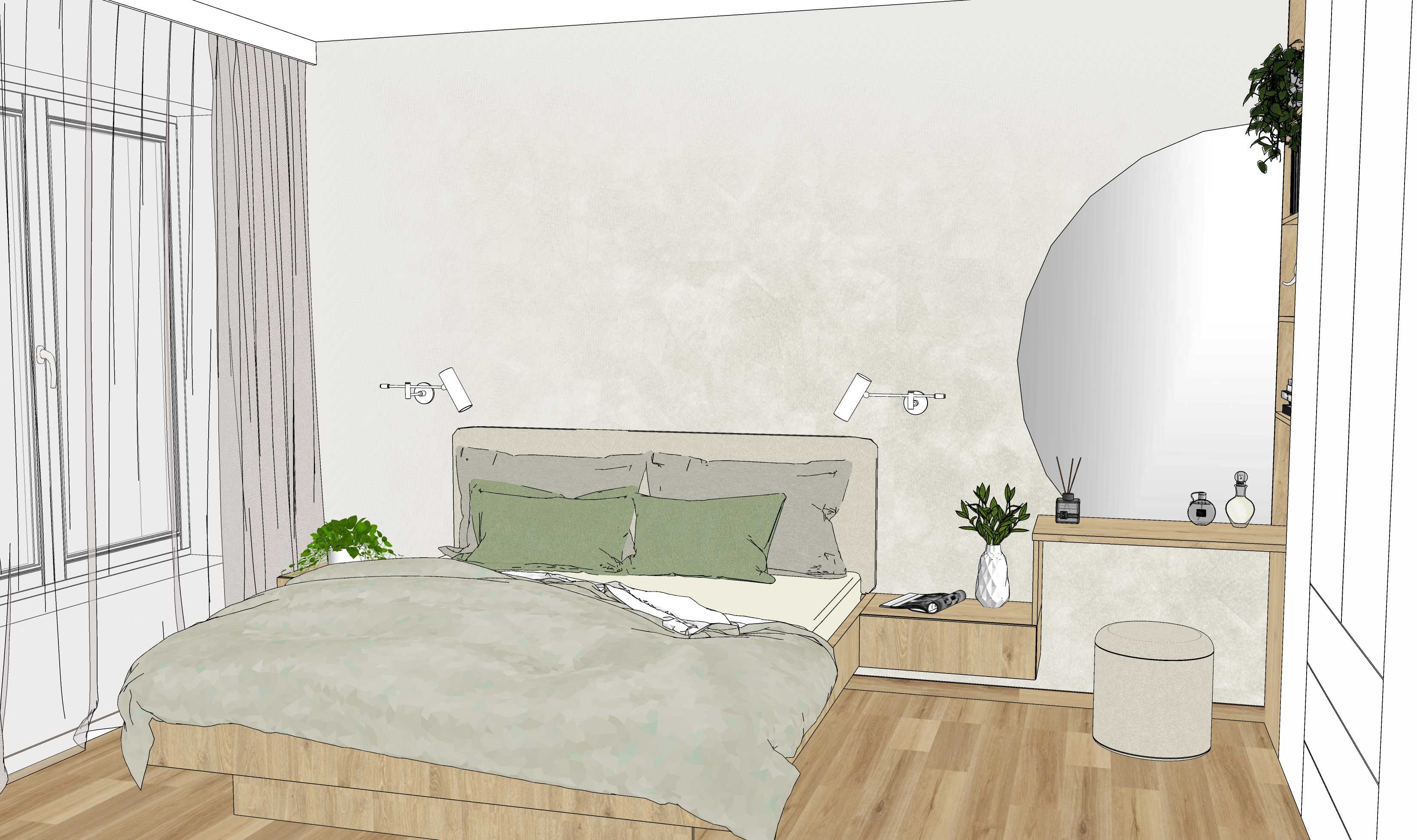 the mirror reflects a white wall and a piece of a white interior door behind the bed keep the spatula from the original picture the curtains at the window are a little more ruffled