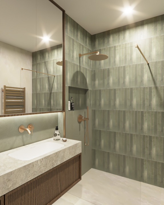 create a beautifully rendered modern living and dining space with earthy neutral tones the room features a sleek open concept design use soft beige for the walls and a warm taupe for the sofa the kitchen cabinets are a subtle grey complemented by a smooth light grey backsplash introduce a rich walnut finish for the shelving and dining table highlight the chairs with a soft sage green fabric include elegant matte white pendant lights for a soft glow the atmosphere is cozy and inviting with natural light streaming in creating a serene and refreshing ambiance