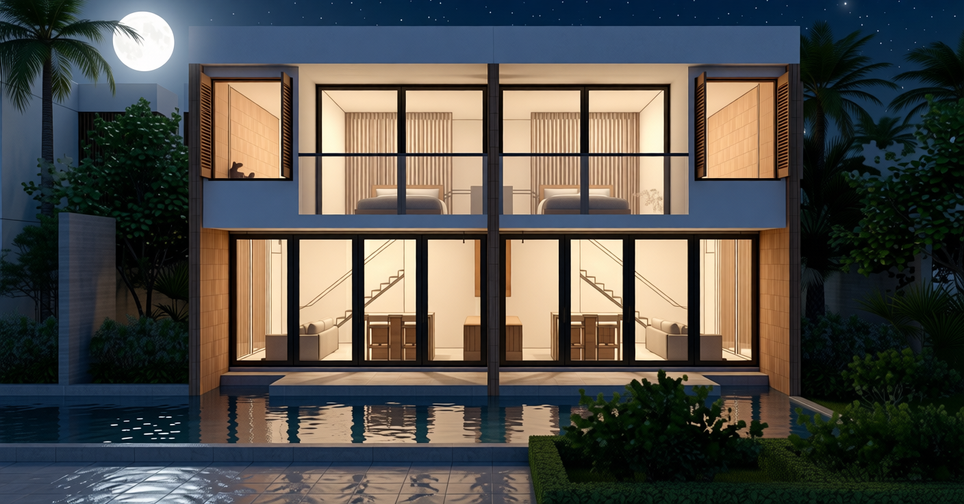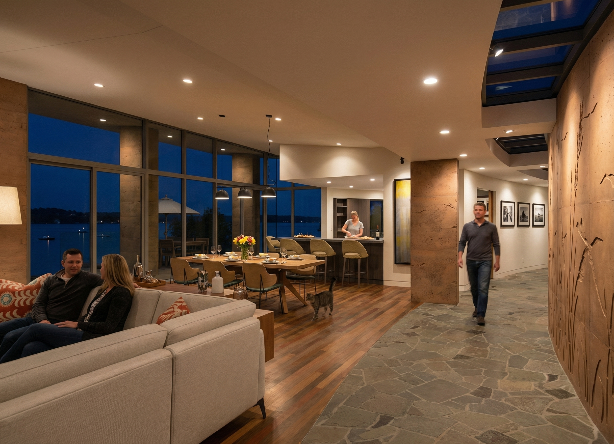 evening view the house is located near pepin wisconsin on top of a bluff overlooking lake pepin towards minnesota the area around the house is planted with native prairie grasses add 3 birch trees and 4 maple trees behind the house the house wall material is site cast concrete with a natural warm clay color and some weathering on the surfaces add some people inside the house add some people on the terraces outside add 3 sailboats on the lake with some small lights on