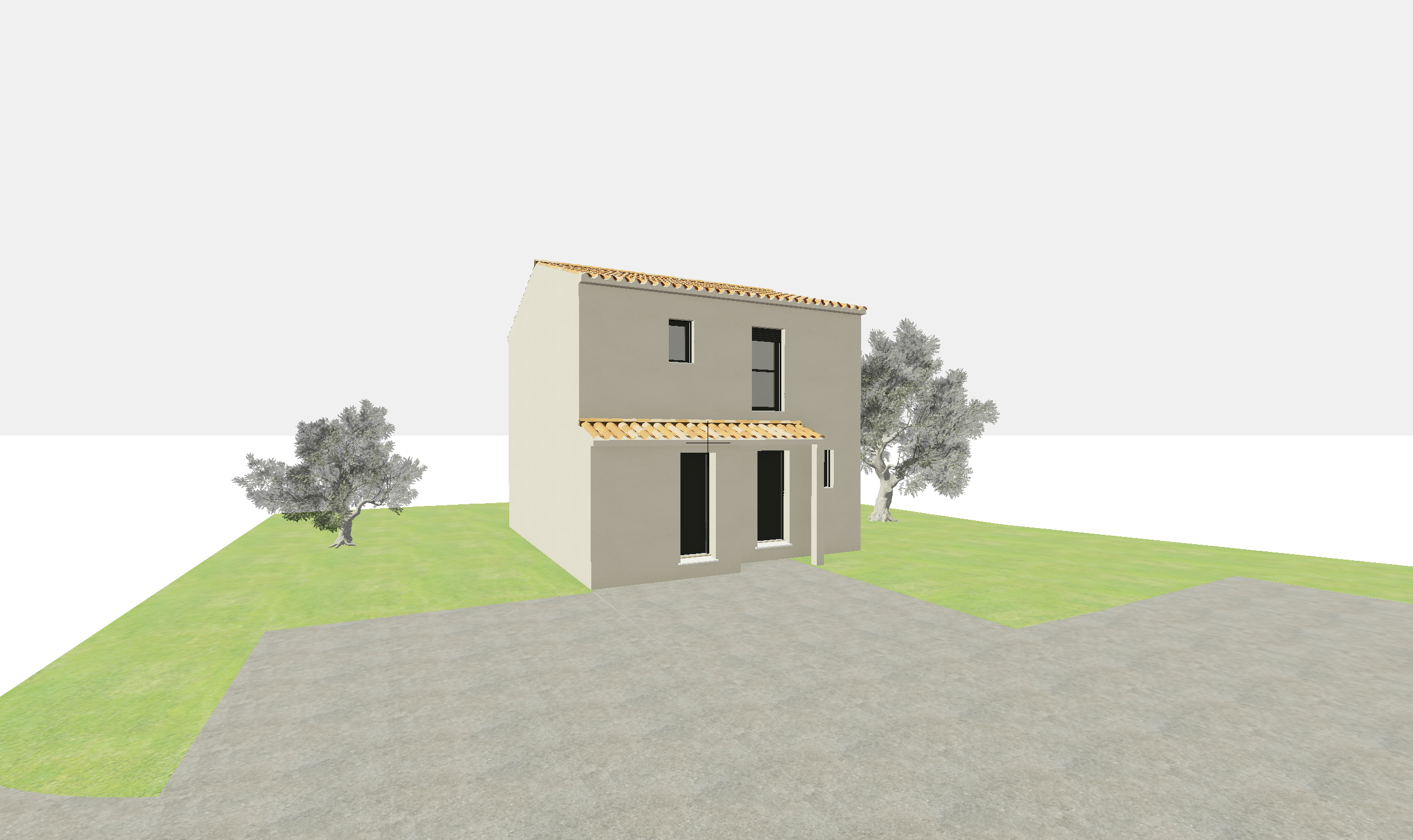 reflects on the windows mediterranean trees and villas in the background add some olive trees near the house a bit of sun on the facade ajoute des lauriers roses sun set in orange and pink sky more trees in the background the facade is more beige more reflects on windows