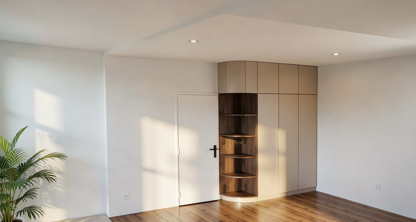 kitchen is a saft wood tone countertops are a light grey kitchen island countetoo waterfalls down the side the bamboo shown is cinatined within an exterior courtyard the livingf room beyin is slighlty raise one foor from the kitchen level