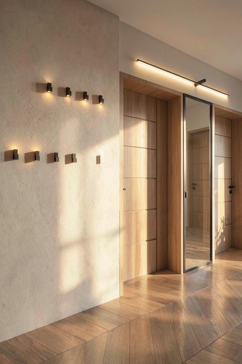 keep the exact same camera angle framing and composition do not change geometry or layout keep all elements exactly as in the original 3d model the lighting fixtures must remain in the exact same positions and alignment as in the 3d model the suspended ceiling must be a knauf cleaneo unity 4 acoustic system uniform micro perforated surface smooth white continuous finish with subtle joint lines and realistic texture integrate regent purelite linear lighting system ultra thin suspended linear luminaires approx 35 mm profile minimalist swiss design continuous linear light lines mounted in the ceiling following exactly the same layout and positions as the lights in the 3d model soft diffused professional architectural lighting realistic illumination the wood furniture must have highly realistic wood grain texture natural tone variation depth and subtle imperfections of real wood the floor must be dark grey epoxy resin seamless continuous finish slightly satin surface subtle material texture professional corporate look ultra realistic architectural visualization pbr materials high detail clean modern finish photorealistic lighting