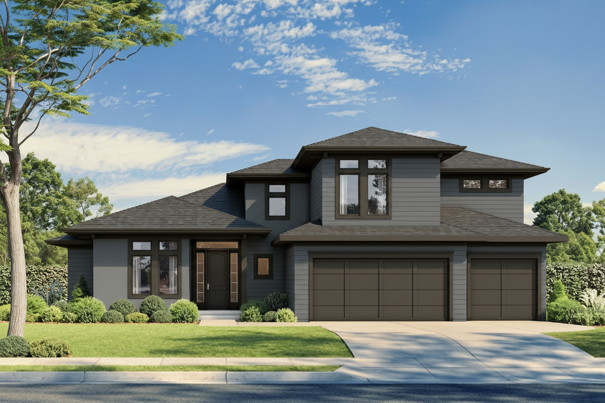 classical exterior shot render a modern suburban house with a bright and inviting atmosphere the house has a classic design with three gables and a two car garage the exterior walls are color and pattern blocked with light and dark colored hardie the roof is a sleek dark charcoal gray black windows with grids do not use brick any where on the house the front steps and entryway are made of light gray stone surround the house with lush green grass and tall mature trees casting soft shadows the sky is clear with a gradient from azure to soft pink as if it s early evening architecture