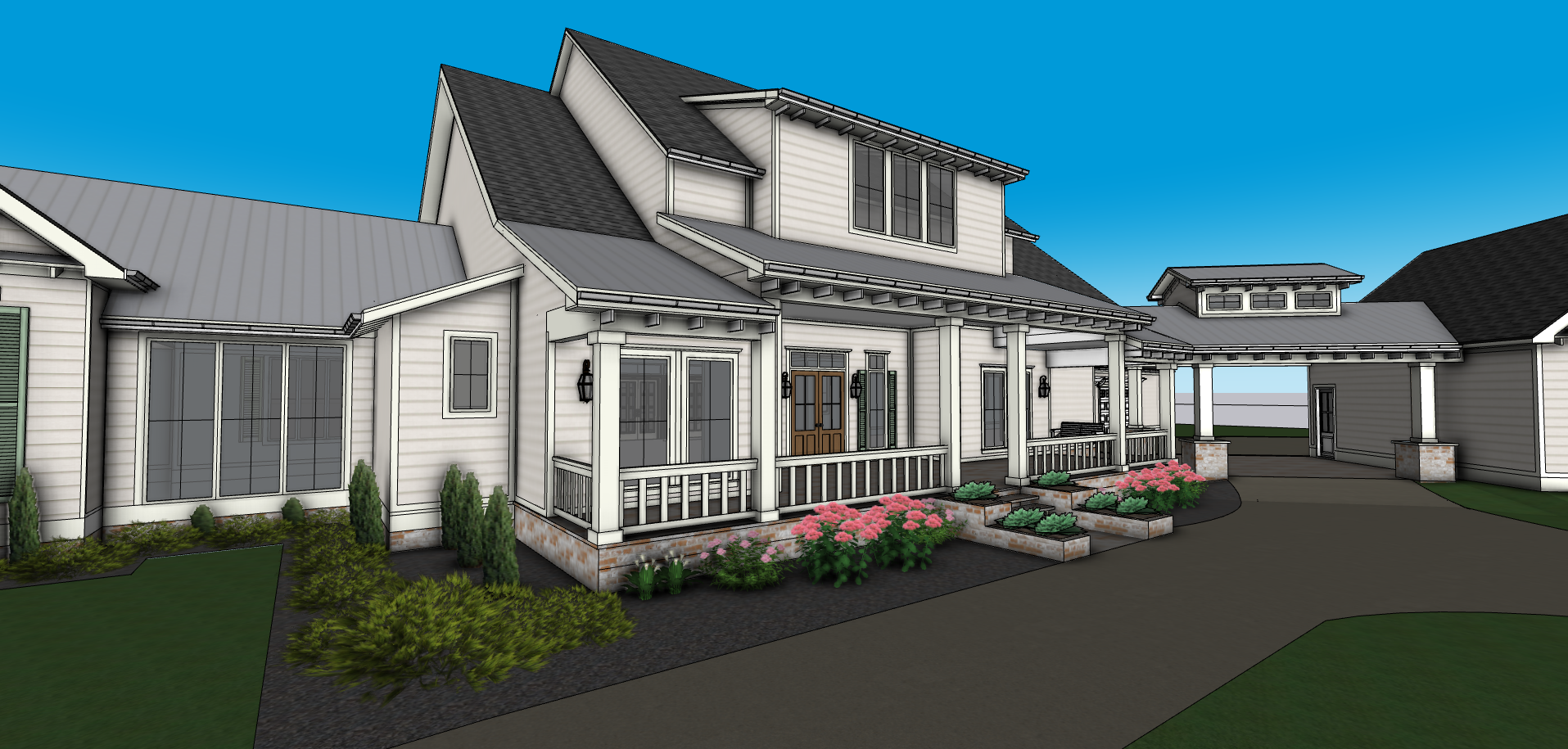 render a beautiful colonial farmhouse surrounded by a lush green lawn the house features white walls with dark gray roofing the windows have low saturation mint green shutters complementing the serene ambiance in front vibrant pink flowers and bushes enhance the landscape the driveway is a smooth concrete pathway the atmosphere is bright and welcoming under a clear blue sky