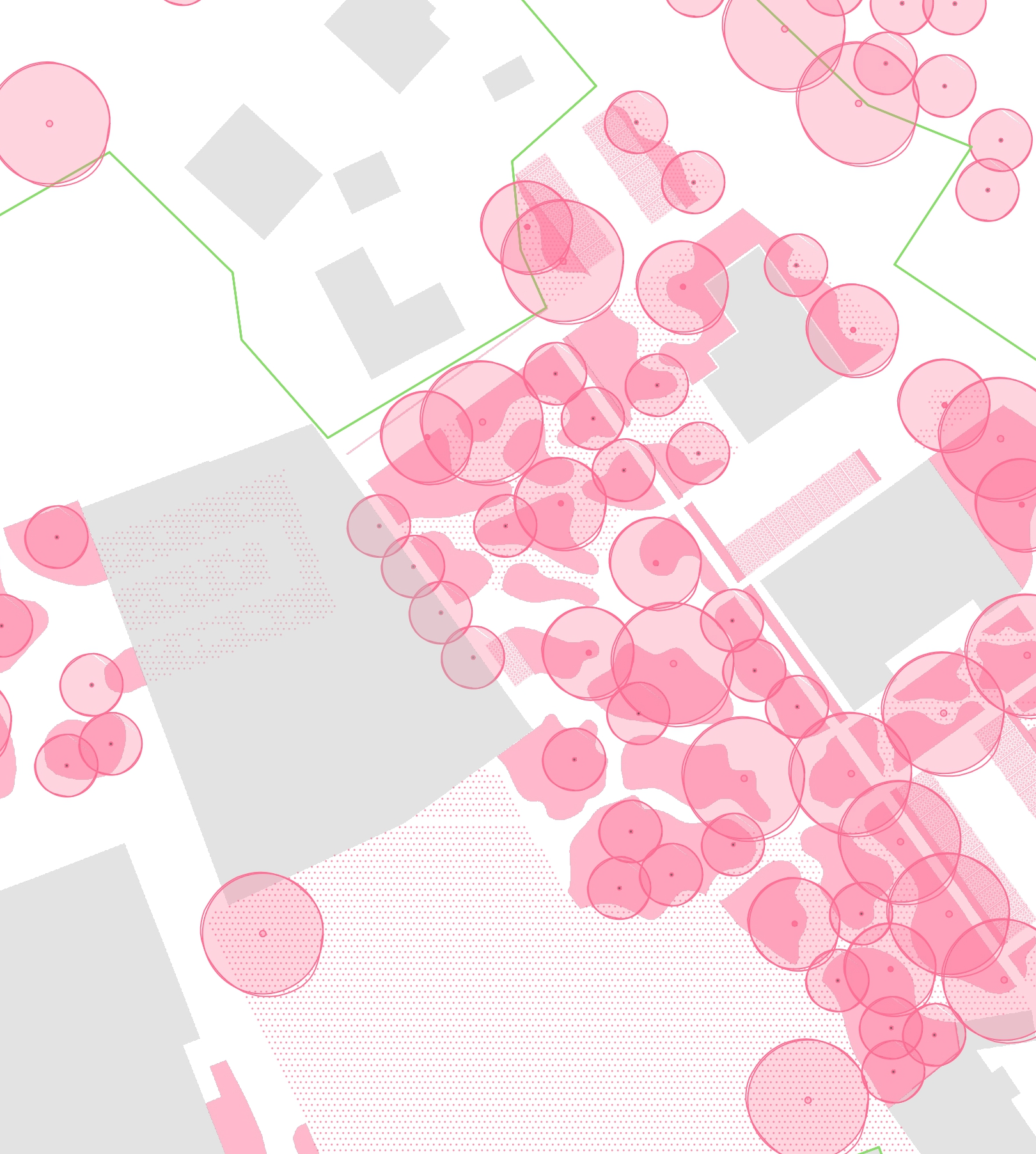 the big pink circles represent trees while the grey squares are buildings the rest of the pink shapes are planted gardens full of purplish pinkish flowers and evergreen shrubbery create a view of how it would look like to walk on ane of the grass pathways through the planted gardens where there are also maple trees