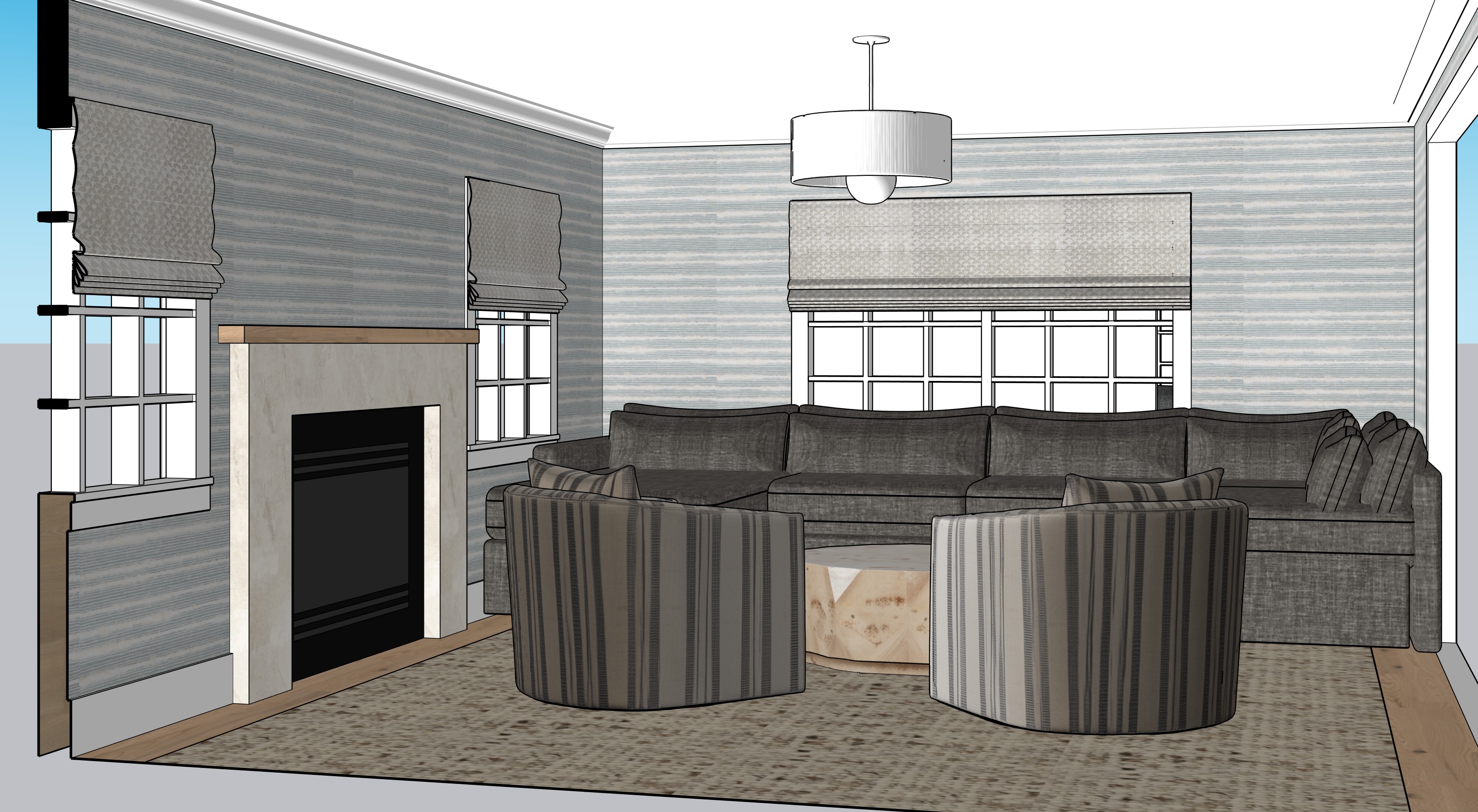the uploaded image is a finished sketchup interior scene with final materials already applied preserve the camera angle room layout and furniture placement exactly as shown all materials must remain unchanged including the fabric the upholstery the rug the fireplace surround the mantel and the wood flooring do not reinterpret fabrics colors or textures enhance the image by adding realistic lighting shadows and material depth only to create a photorealistic architectural rendering strict preservation keep all fabrics patterns colors and materials exactly as shown material fidelity required