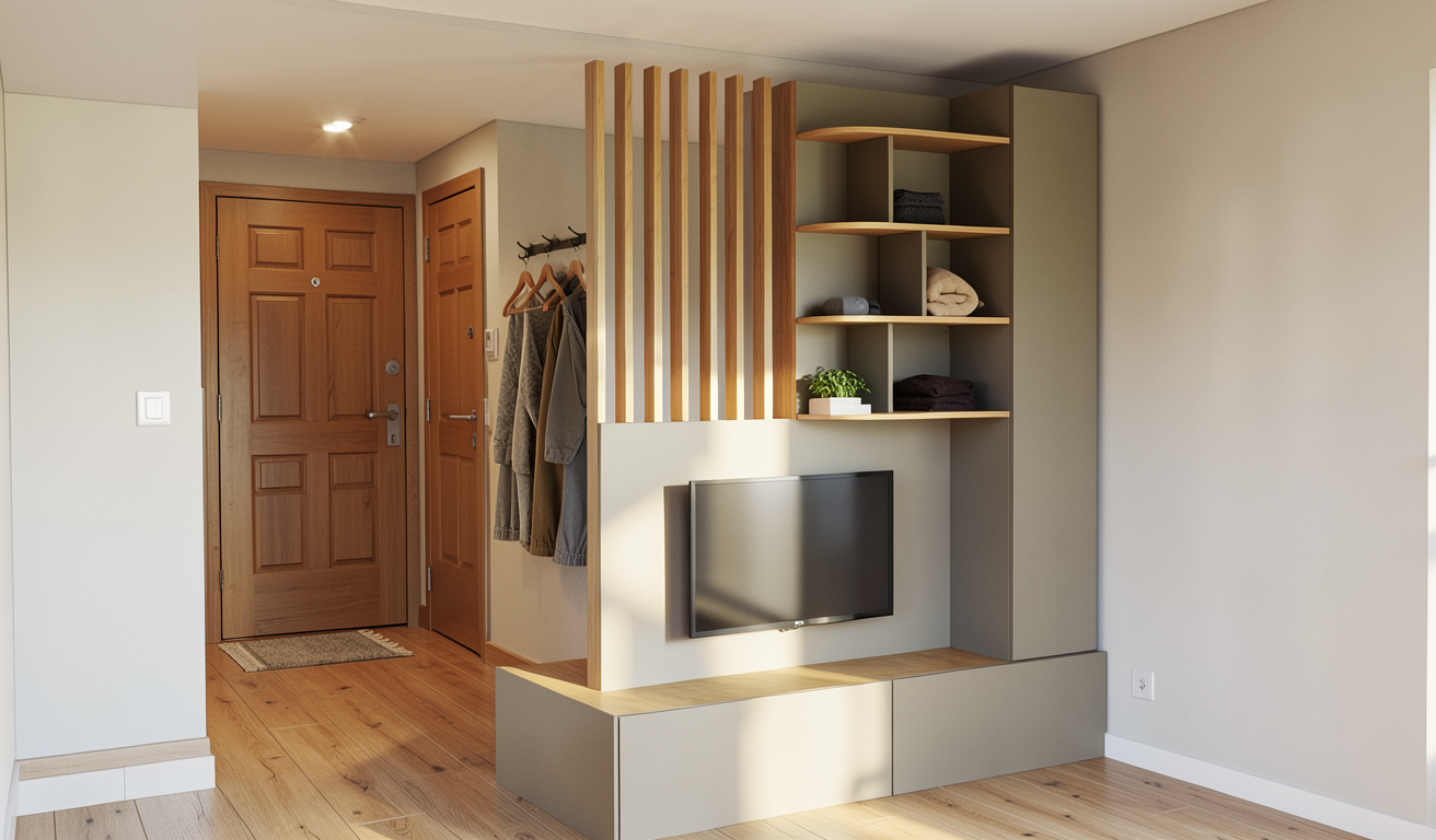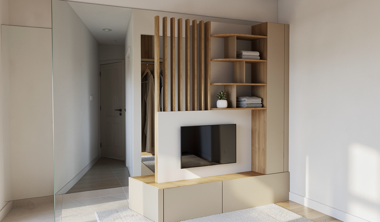 fait un rendu photo r aliste partir de cette vue 3d ceci est un meuble d entr e qui cache le couloir d entr e de la maison et des portemanteaux le couloir d entr e est parall le au meuble on ne voit pas la porte d entr e juste le mur derriere le meuble sur lequel il y a les portemanteaux ce mur n a pas de miroir