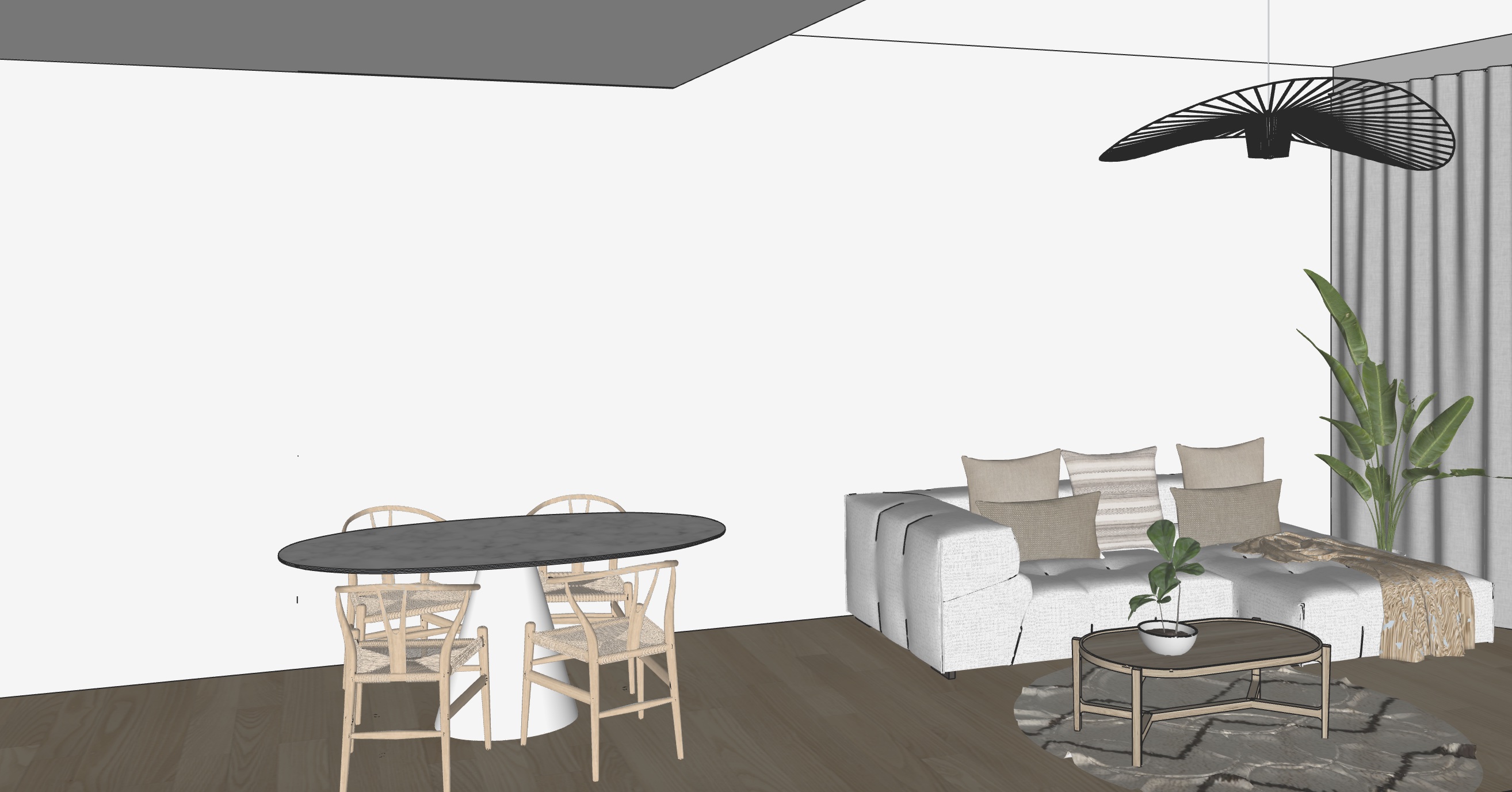 add led spotlights in the false ceiling above the dining area add art on the walls warm ligths scandinavian vibes