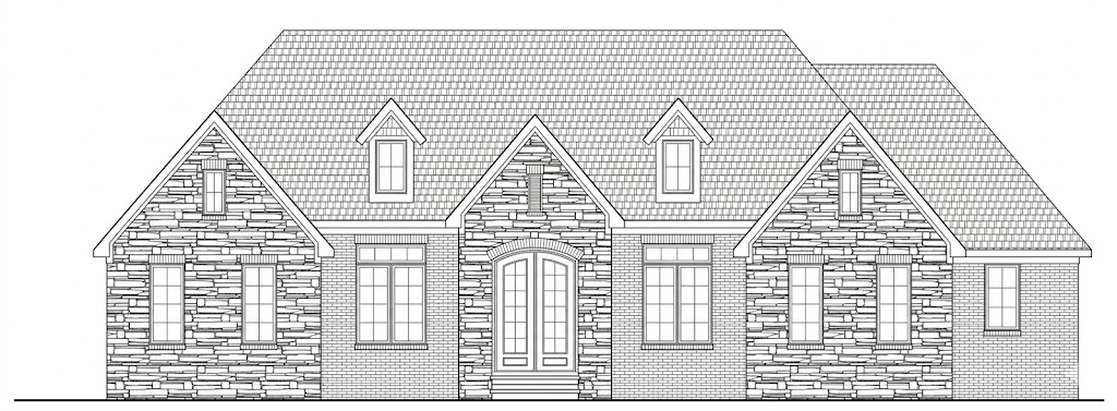 create a photorealistic image of this house exterior use the silverledge reference image for the stone fronts the stones are 3 4inches high use the other reference image for the brick make the roof dark gray and the door and trim black do not add shutters make sure the stone extends all the way to the bottom