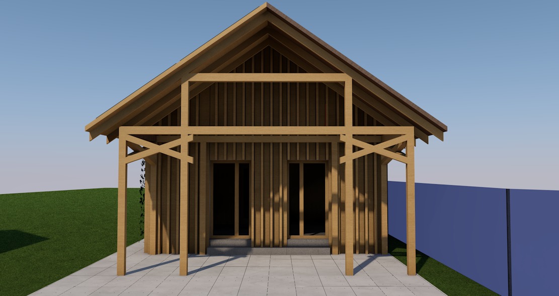 the cladding on the house should be wooden with a slightly grey tone like slightly faded wood add realistic reflections to the glass on the facade where i have paving replace it with large format medium grey concrete paving with no visible joints modern paving where i have grass add a realistic beautiful natural lawn