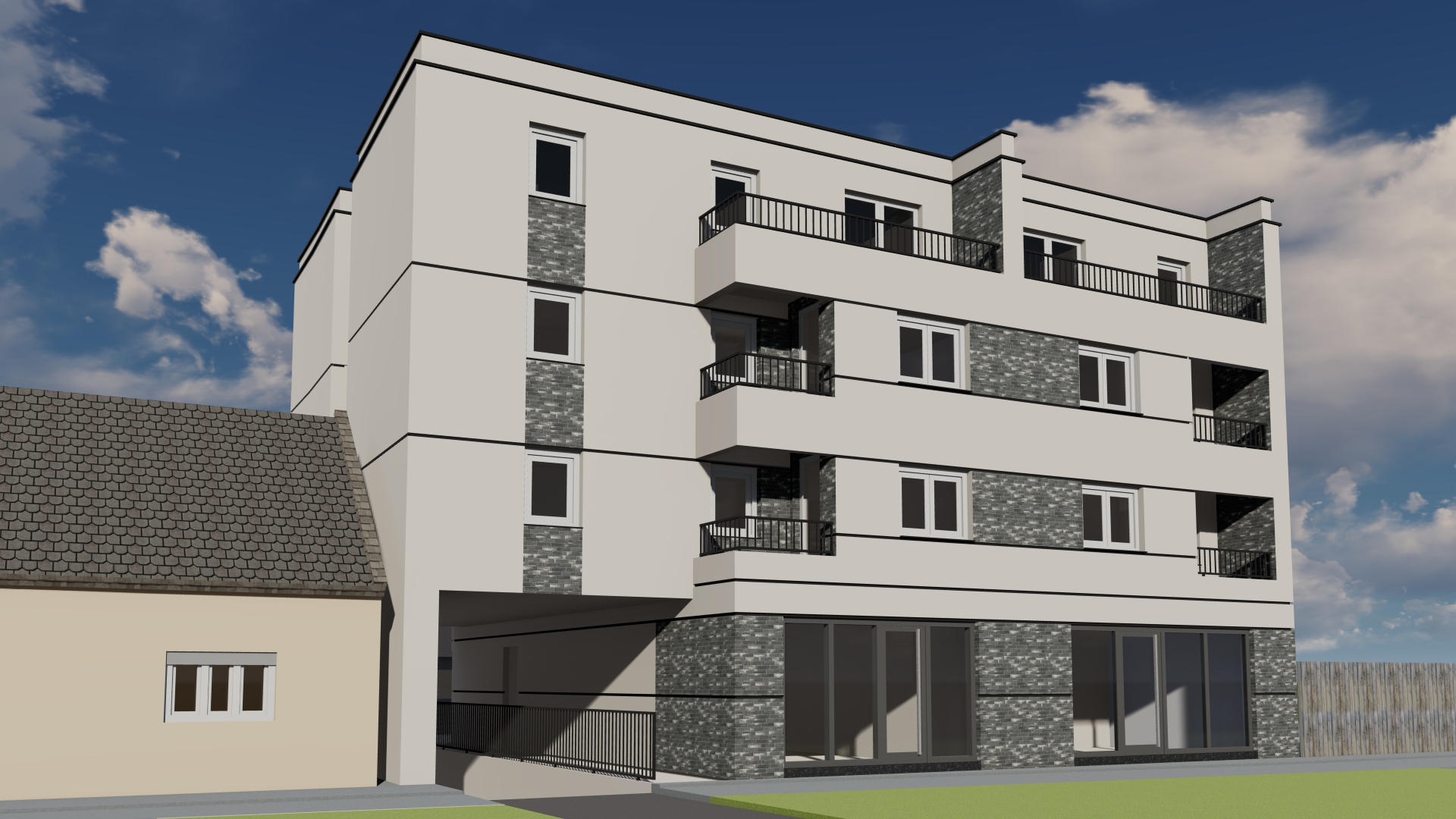 a modern multi story building with a light beige fa ade featuring dark gray stone accents and black railings the structure includes multiple balconies with large windows to the left a smaller building with a dark shingle roof and light yellow walls the environment is a clear sunny day with a soft blue sky and vibrant green grass in the foreground emphasize clean lines and a minimalist aesthetic adding touches of light reflection on the windows to enhance realism atmosphere calm and contemporary with a focus on architectural beauty on the left side of the modern building is the car entrance in shadow leading downwards a a a car ramp keep original textures and colors in original positions make windows on upper floors white make shop windows on the ground floor in grey color with glass a little bit translucent make two spaces on the ground floor like office spaces but do not show curtains and put office furniture in those two places and soft office light make curtains visible behind windows on upper floors keep every form as it is do not add forms on buildings keep shadows like in original photo