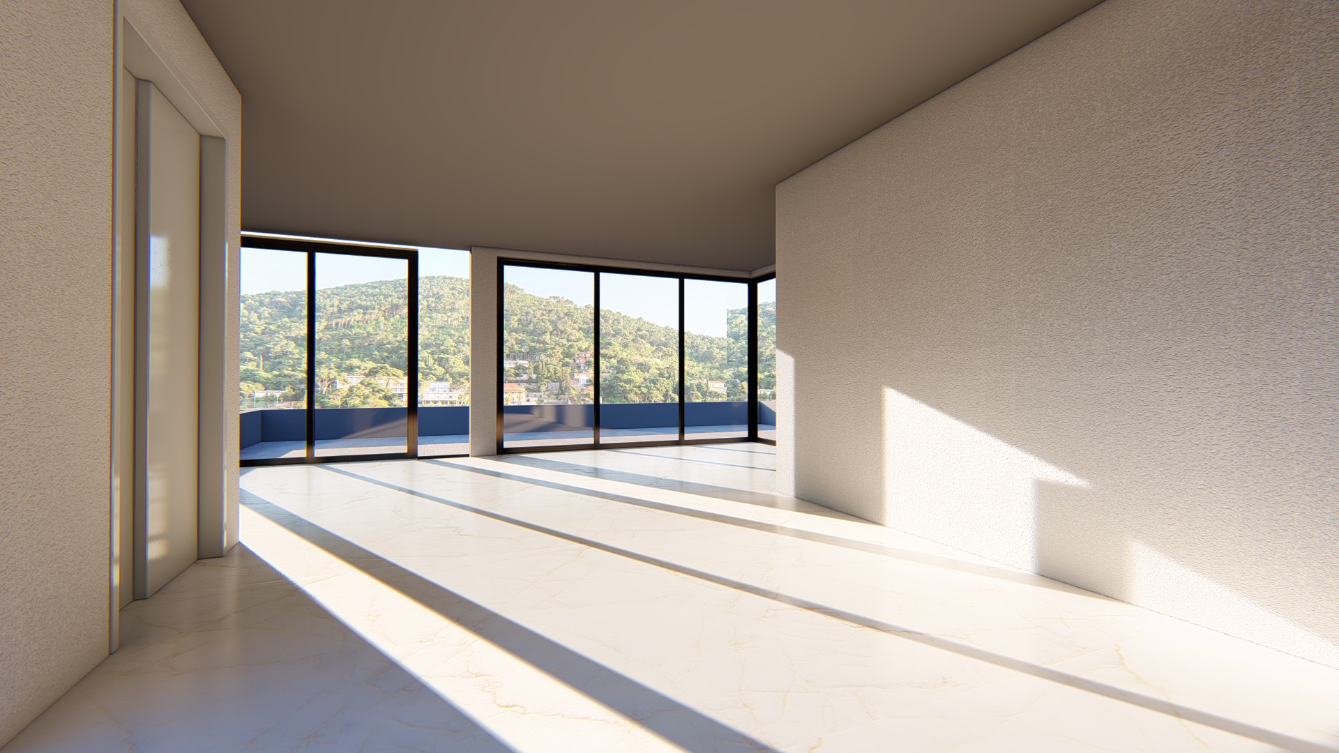 minimalistic dinning room if first plan and living room on the second plan infront of the glass windows