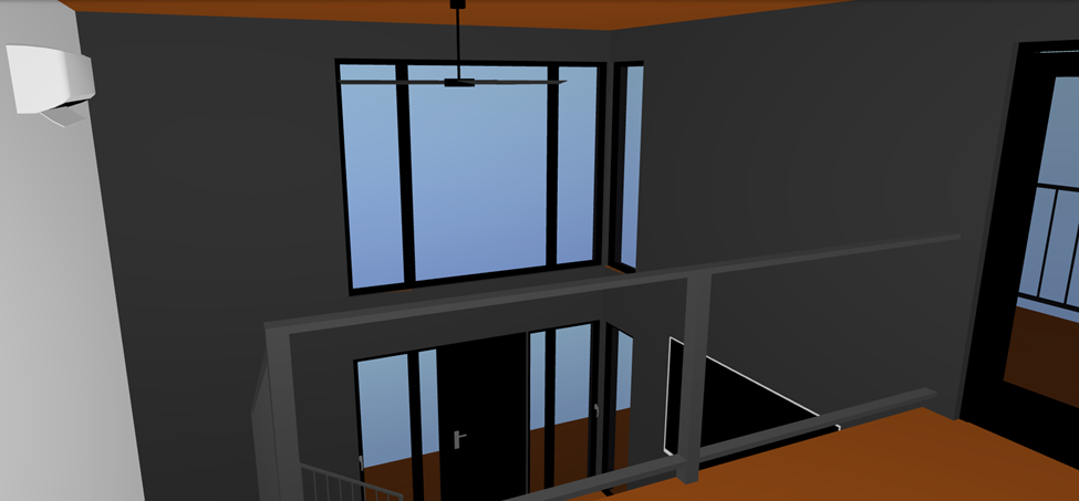 this is the main living space in a small modern home shot from the loft area on the second floor towards the front door the wall with the gas lit fireplace and tv should have large colorful floral tiles that go from floor to ceiling the ceiling and floor should be in a walnut plank with the walnut planks going front to back golden hour lighting