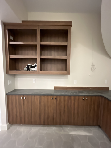 do not change the cabinets in any way preserve the exact cabinet colors materials finishes dimensions door and drawer styles hardware spacing alignment and all geometry exactly as shown do not alter the countertop shape backsplash appliances flooring lighting fixtures or wall structure only remove the construction materials clutter and mess from the scene clean the room and make it look finished and staged add a few simple tasteful home accessories appropriate for the style of the space but do not add or remove any furniture windows or architectural elements maintain the original lighting direction and realism enhance clarity and polish the photo while keeping the cabinetry and room design completely unchanged do not alter the lighting to keep the cabinet colors as they are in the image stage for a gaming bar add a backsplash