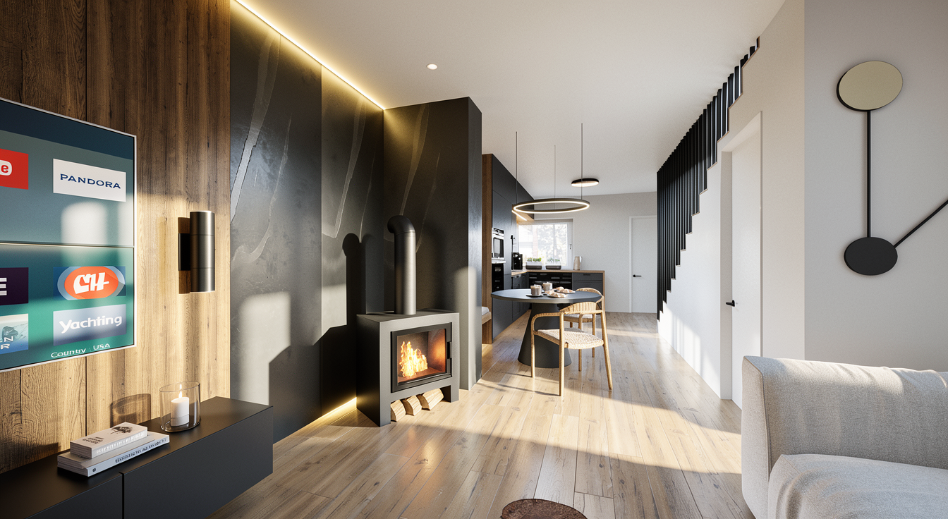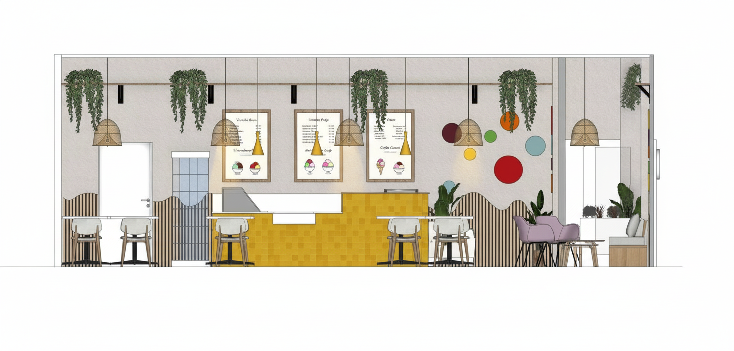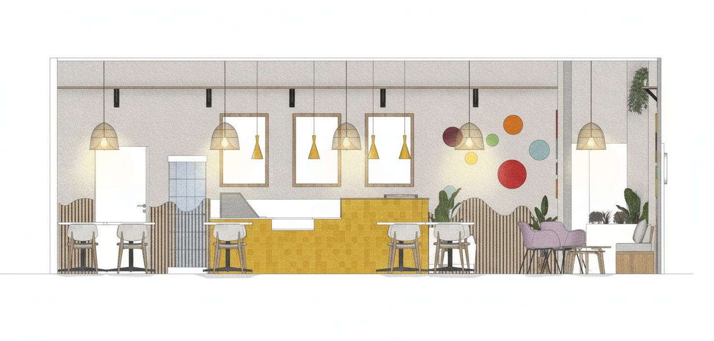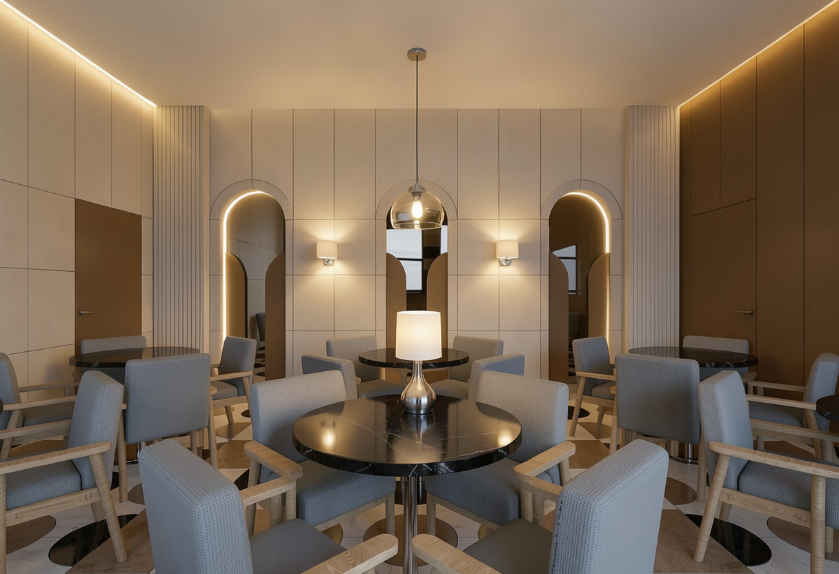 preserve exactly the existing camera position framing perspective scale proportions geometry textures colors and functions of all architectural and furniture elements do not move resize redesign remove or replace any walls niches panels arches tables chairs ceiling surfaces or floor elements only enhance material realism texture fidelity lighting quality and atmosphere to achieve a more refined warm and elegant interior rendering lighting additions 1 ceiling contour lighting add concealed warm led strip lighting strictly along the perimeter contour of the ceiling the led must be hidden in a narrow shadow gap where the ceiling meets the wall it must create soft indirect warm light 2700k washing gently down the walls no other alterations to the ceiling geometry or surfaces are allowed no recessed fixtures no spotlights no additional ceiling modifications 2 vaulted niche lighting add concealed warm led strip lighting integrated along the inner contour of each vaulted niche the led source must be invisible only softly outlining the arch curvature decorative light fixtures all fixtures must follow these design rules style refined mid century inspired but clean and contemporary not antiquated materials predominantly polished chrome with secondary frosted glass elements appearance minimal elegant and balanced with the architecture 3 wall lamps place one wall lamp exactly centered between the left niche and the center niche place one wall lamp exactly centered between the right niche and the center niche these lamps must be installed only on the wall that the camera faces no other wall lamps anywhere in the room 4 table lamps place one table lamp precisely at the center of every visible table lamps must sit proportionally and not obstruct the view of the interior 5 pendant ceiling lamps add one pendant ceiling lamp aligned with the vertical axis of each vaulted niche the pendants should hang centrally in front of the niches and be visually balanced with the architecture lighting restrictions strictly prohibit spotlights recessed downlights track lighting additional wall lamps additional ceiling fixtures any change to furniture or architecture atmosphere render a warm sophisticated caf lounge atmosphere with soft indirect illumination subtle chrome reflections gentle highlights on the wall panels and arches balanced exposure and realistic material textures