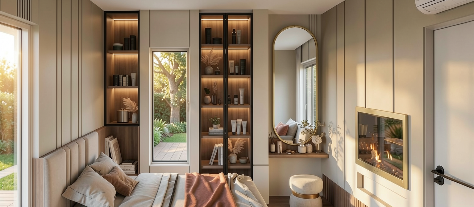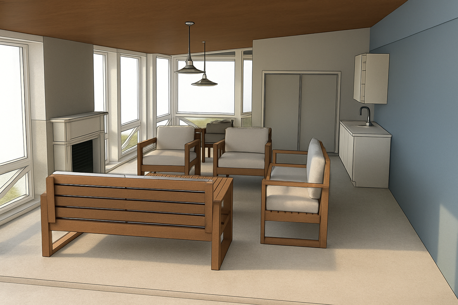 render this as a screened in porch 3 season room use a grey toned decking on the floor surface and add an area rug to the living area make it sunlit and inviting make the fireplace white