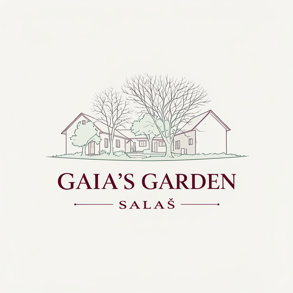 create a refined elegant line art logo for a countryside venue called gaia s garden sala style inspired by premium winery branding like european vineyard estates thin precise line drawing architectural illustration style composition centered building illustration traditional farmhouse complex clean horizontal layout no circle no badge text below the illustration gaia s garden large serif sala smaller spaced letters building illustration simple but refined linework visible roof geometry minimal windows and doors indicated no shading no fills no heavy black masses tree subtle simplified secondary element color deep forest green or dark wine red off white background mood luxury rural retreat winery estate branding timeless elegant premium avoid thick lines cartoon style detailed shading badge or circular logo