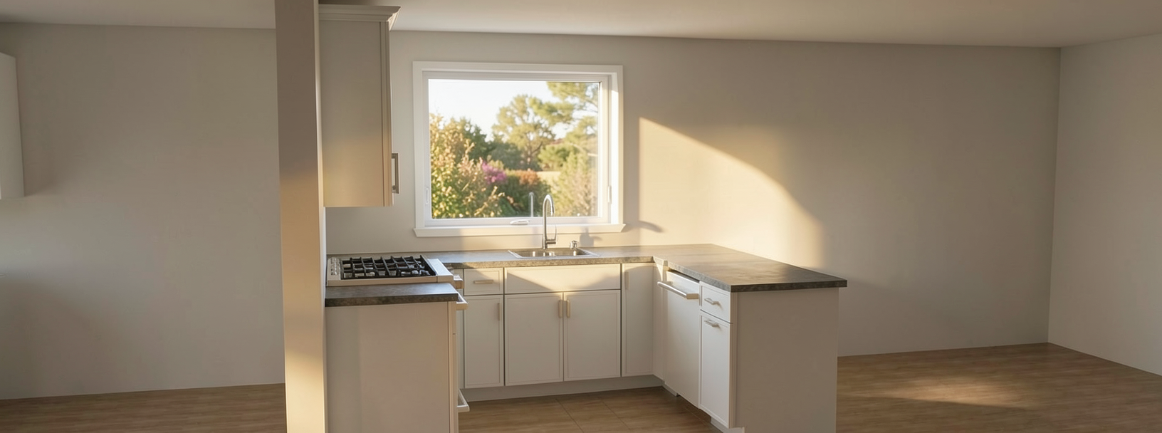 add a glass sliding door to the right of the kitchen on the wall right next to the cabinets