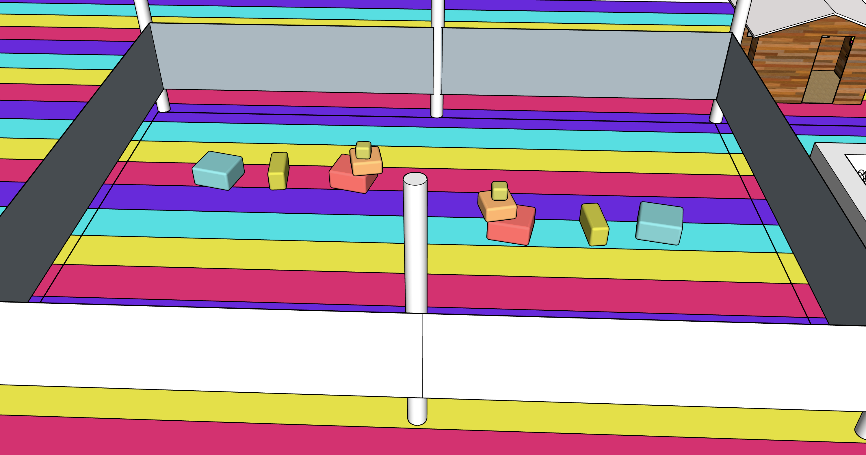 the floor remains the color you see in the photo but make it look like a colored artificial turf the space is 200 square meters and add 2 teams of kids one each side throwing small water bombs to each other add some white obstacles where they can hide put nets around