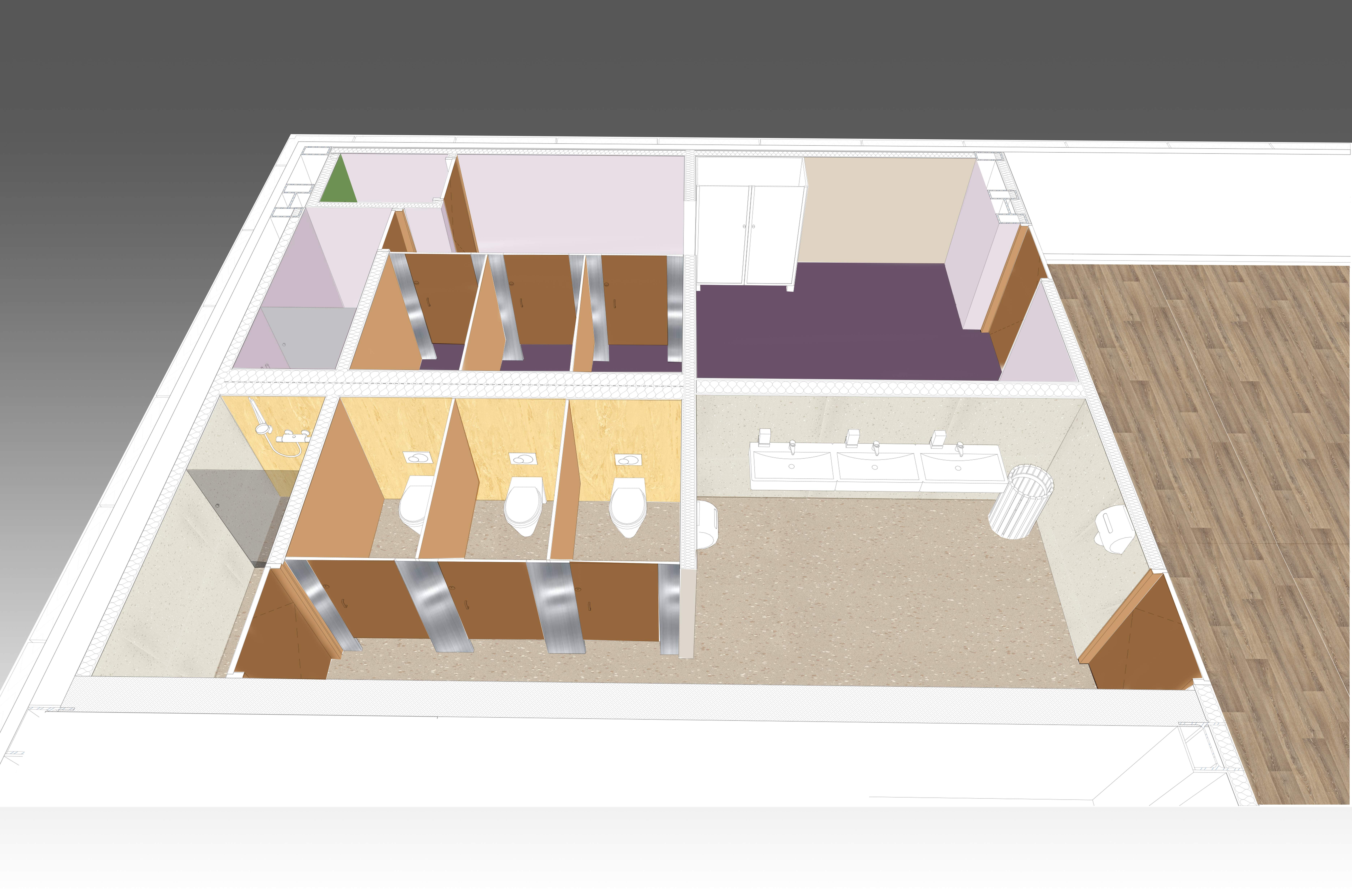 it is a wetroom with a washroom toilets and shower room make it realistic keep textures and colours as possible the brown colours are wooden materials the other colours are semi gloss vinyl wall and flooring coverings