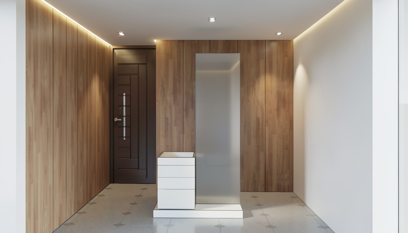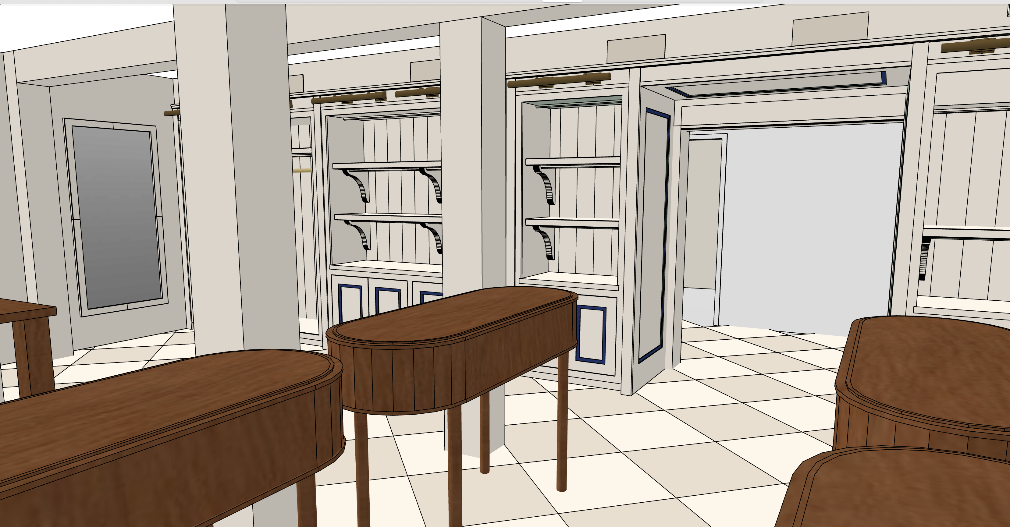 render this with no additional windows make the floor matte painted wood and make the sides and top of the brown furniture glass