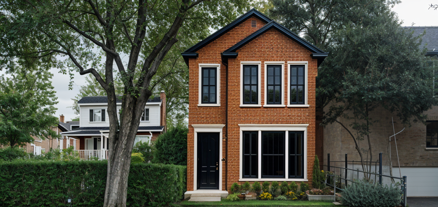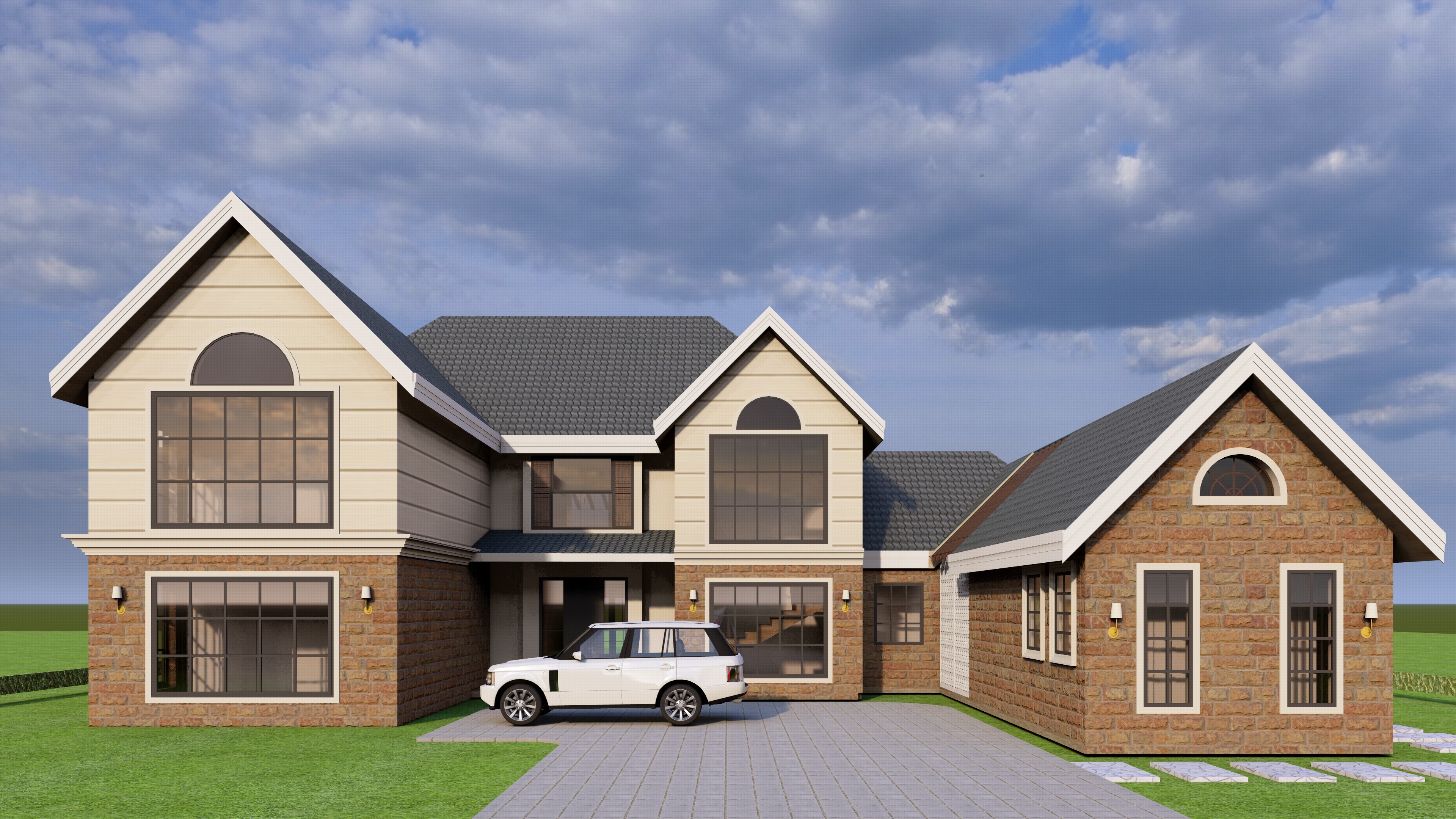 this is a model of a house the upper parts should be beidge plaster finish with horizontal key lines the lower parts with brown stone should be yellowish brownish rough rectangular stone add interior creamish warm lighting low brightness add few trees in background and vegetation to give it context