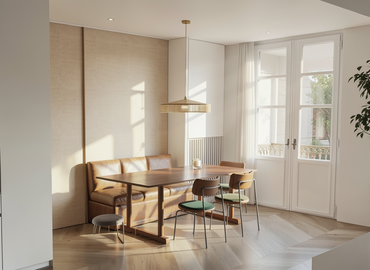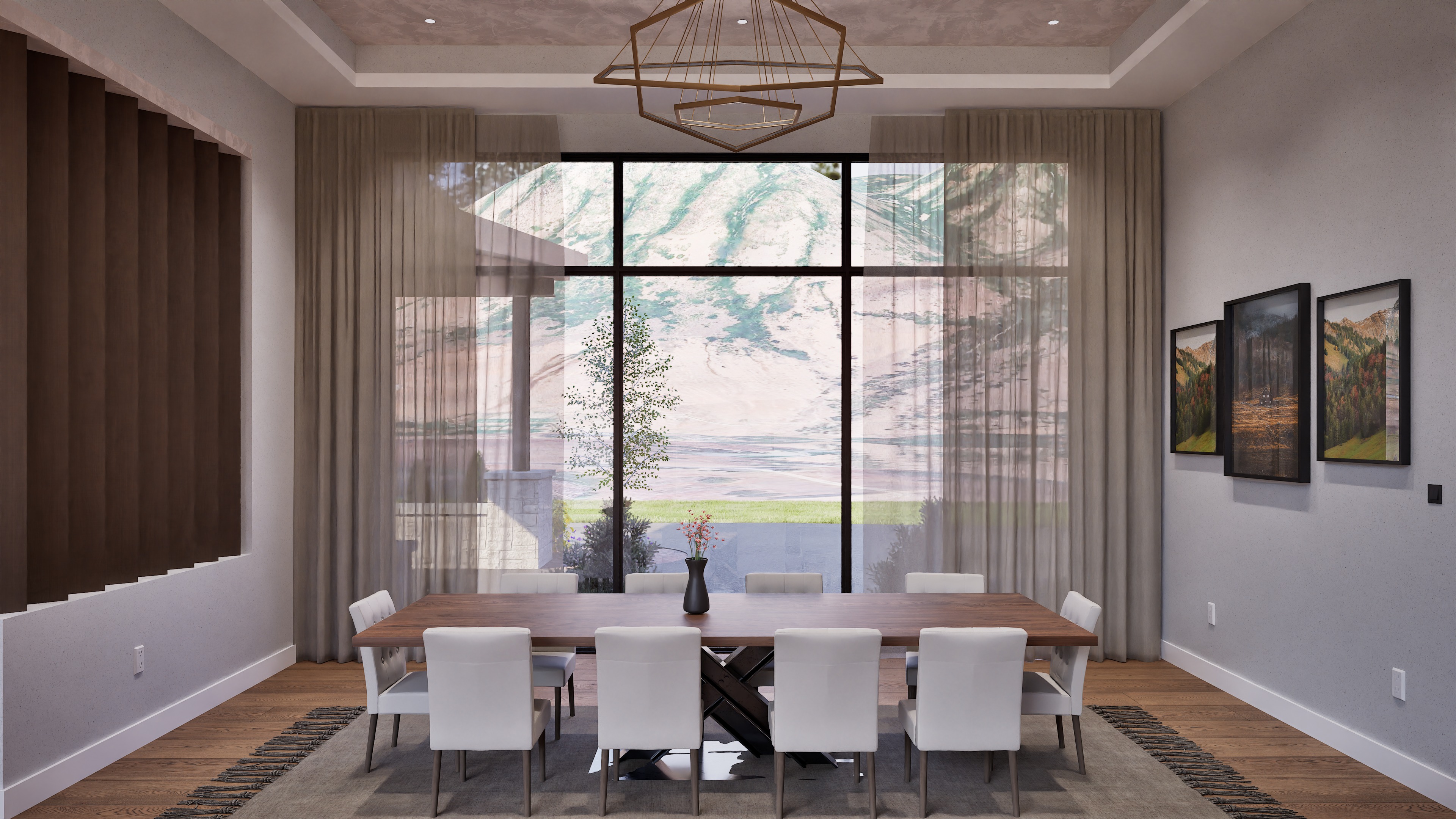 a dining room with a mountain backdrop dont change the terrain outside the window but enhance it to look more realistic with better texture and trees and dirt enhance the lighting inside with the chandelier giving off a soft light increase the decorations on the dining table and make the materials and textures look more realistic