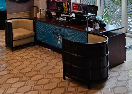modernist interior shot a modern office reception area with an elegant and inviting atmosphere the desk is crafted from rich bamboo finish exuding a deep warm brown tone intricate tag line water park the chairs are designed with luxurious beige cushions surrounded by wooden prices adding sophistication the floor features a geometric patterned tile in beige and cream harmonizing with the overall aesthetic soft natural light filters through large windows complemented by lush greenery outside creating a serene and welcoming ambiance architecture